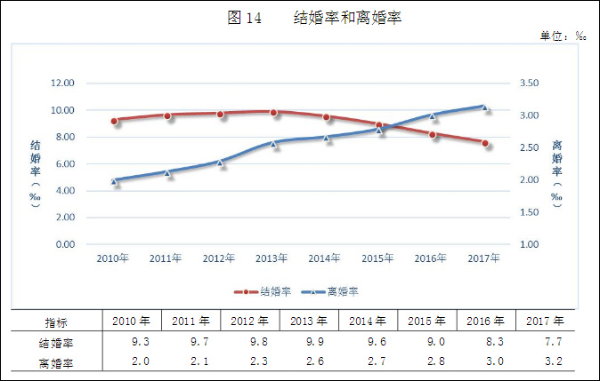 China’s marriage rate and divorce rate from 2010 to 2017./ Photo via Ministry of Civil Affairs