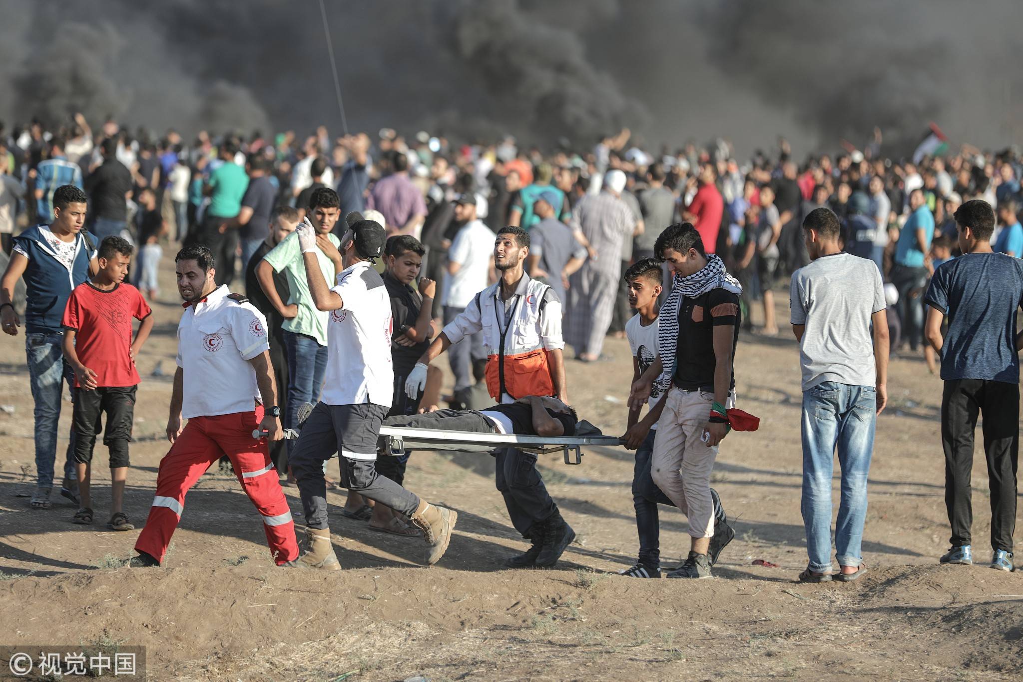 Palestinians carry an injured man after Israeli security forces opened fire at protesters on Gaza-Israel border, August 10, 2018. /VCG Photo