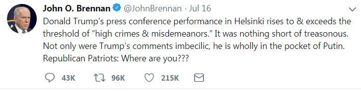 Brennan suggested in a tweet that Trump could be impeached, saying his performance in Helsinki "rises to & exceeds the threshold of 'high crimes & misdemeanors'" and was "nothing short of treasonous."