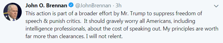 "This action is part of a broader effort by Mr. Trump to suppress freedom of speech & punish critics. It should gravely worry all Americans, including intelligence professionals, about the cost of speaking out. My principles are worth far more than clearances. I will not relent," he said.