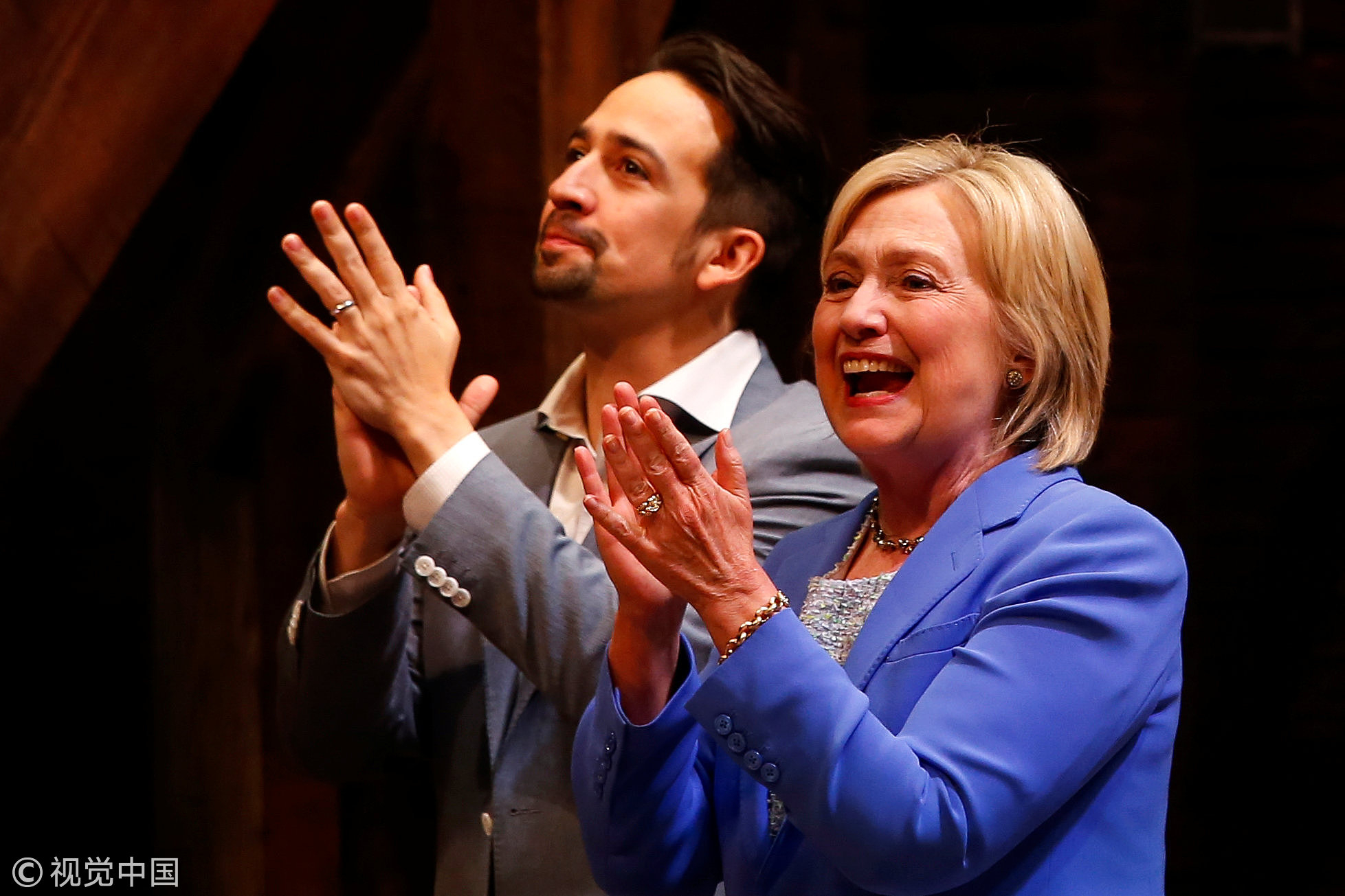 July 12, 2016: US Democratic presidential candidate Hillary Clinton (R) and actor Lin-Manuel Miranda applaud after a special performance of the Broadway musical "Hamilton" in, Manhattan, New York, US. /VCG Photo