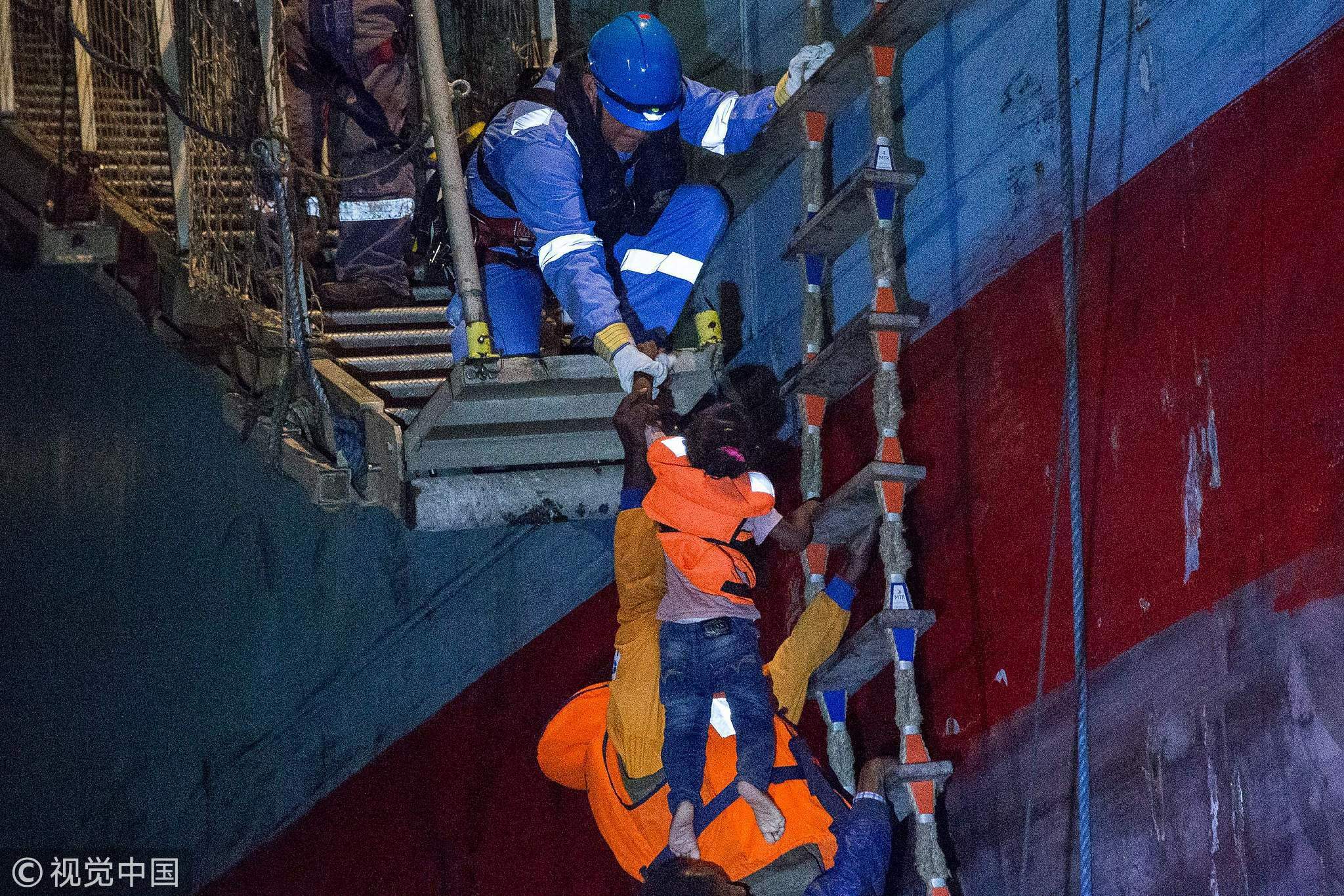 Migrants board a container ship after they were rescued from a shipwrecked vessel at sea, June 23, 2018. /VCG Photo