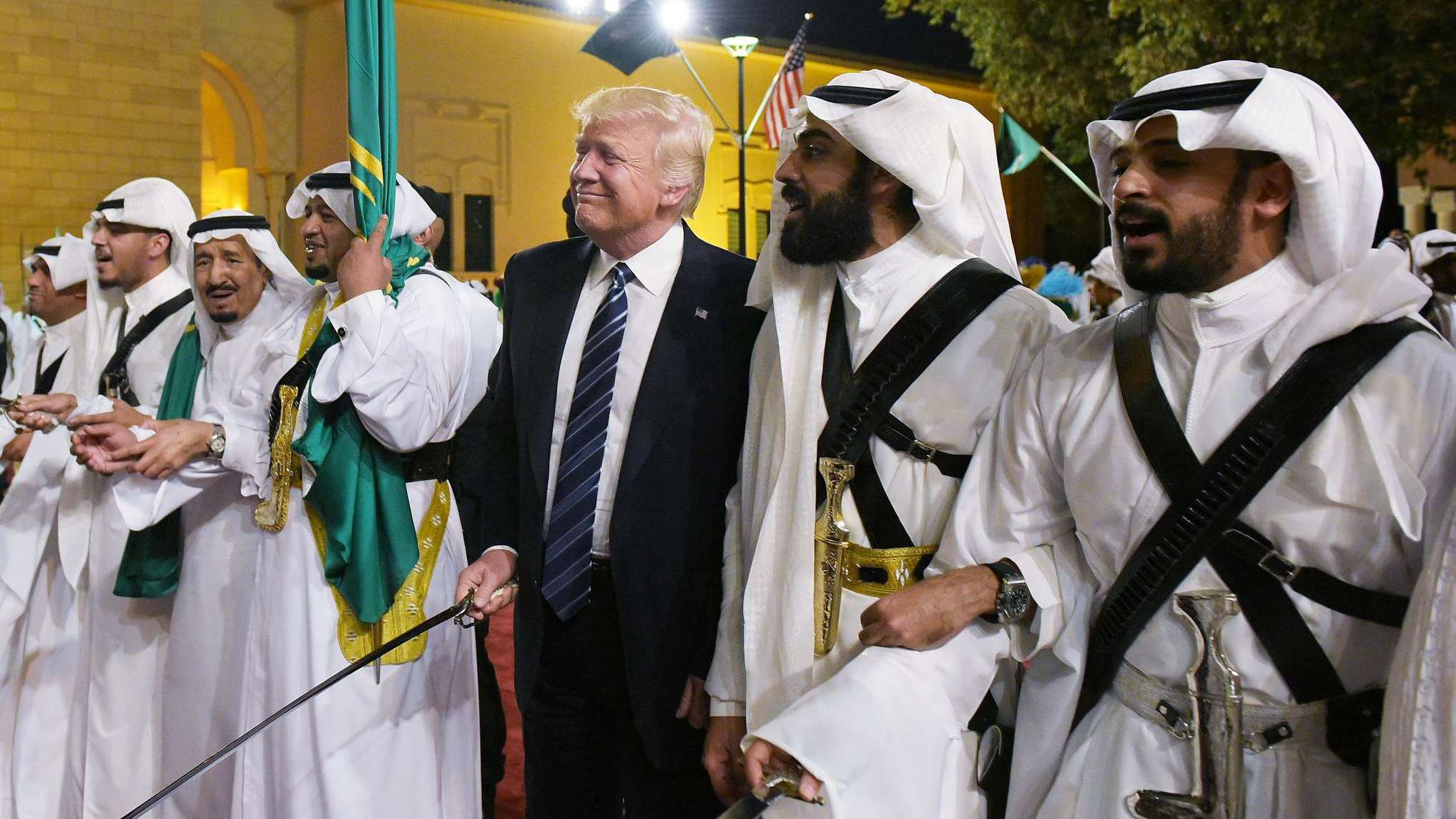 May 20, 2017: US President Donald Trump joins dancers with swords at a welcome ceremony ahead of a banquet at the Murabba Palace in Riyadh. /VCG Photo