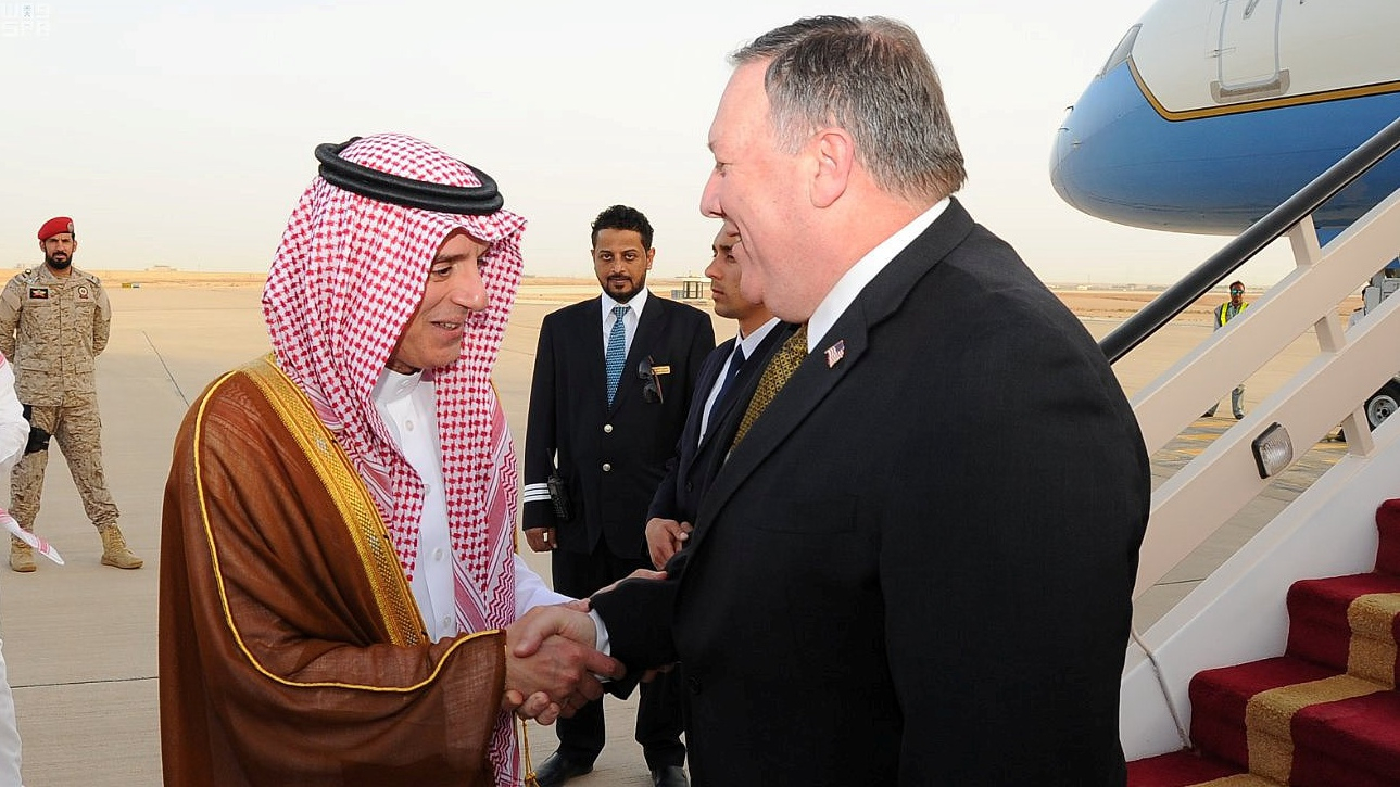 US Secretary of State Mike Pompeo shakes hands with Saudi Foreign Minister Adel Al-Jubeir upon his arrival in Riyadh, Saudi Arabia, April 28, 2018. /VCG Photo