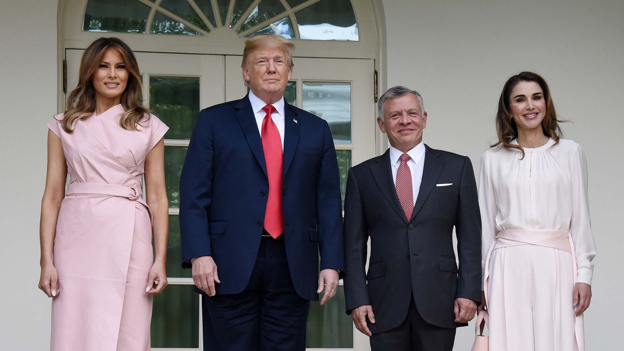 US President Donald Trump and first lady Melania Trump pose with King Abdullah II and Queen Rania of Jordan on the colonnade of the White House, June 25, 2018. /VCG Photo