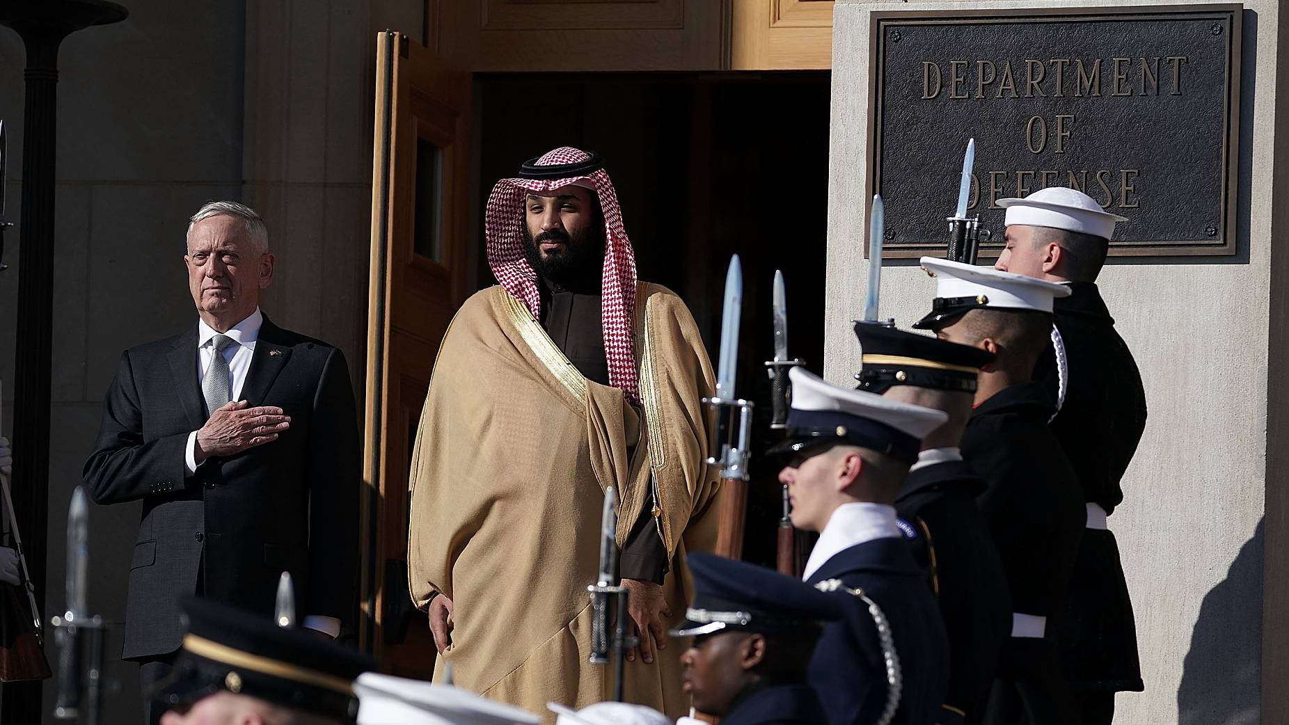 US Secretary of Defense Jim Mattis (L) welcomes Crown Prince of Saudi Arabia Mohammad Bin Salman (R) during an enhanced honor cordon, March 22, 2018, at the Pentagon in Arlington, Virginia. /VCG Photo