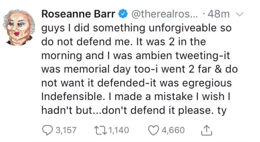 “Guys I did something unforgivable so do not defend me. It was 2 in the morning and I was ambien tweeting – it was memorial day too – I went 2 far & do not want it defended-it was egregious Indefensible. I made a mistake I wish I hadn’t but…don’t defend it, please. Thank you“