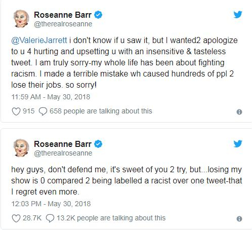 Hours after Barr unleashed the initial offensive tweet, ABC pulled the plug on her show, “Roseanne.” The sitcom revival was the most-watched television show in the US this season.