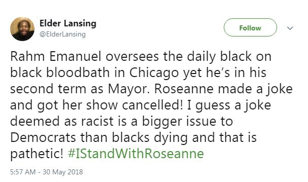 “… Roseanne made a joke and got her show canceled! I guess a joke deemed as racist is a bigger issue to Democrats than blacks dying and that is pathetic! #IStandWithRoseanne”