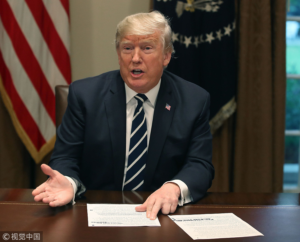 U.S. President Donald Trump talks about his meeting with Russian President Vladimir Putin during a meeting with House Republicans in the White House, July 17, 2018. /VCG Photo