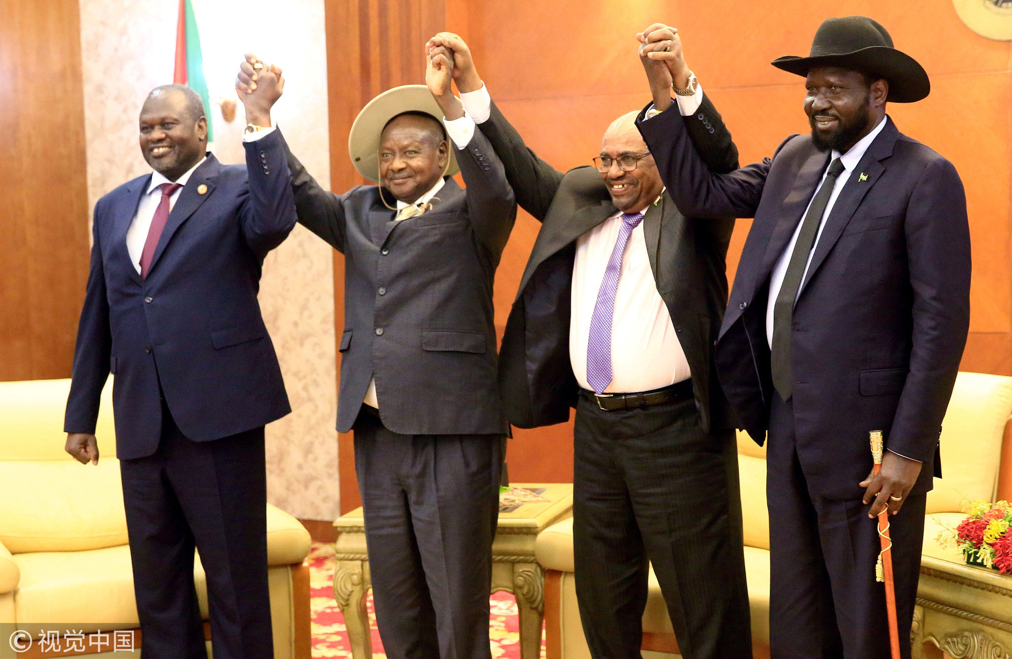 (From left to right) Rebel leader Riek Machar, Uganda's President Yoweri Musevenirebel, Sudan's President Omar Al-Bashir and South Sudan's President Salva Kiir hold hands during a South Sudan peace meeting as part of talks to negotiate an end to a civil war that broke out in 2013, in Khartoum, Sudan, June 25, 2018. /VCG Photo