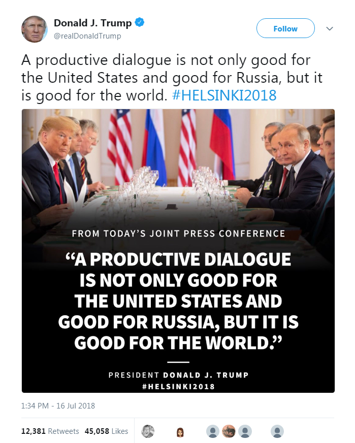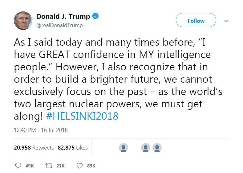 Hours after the Helsinki summit, Trump tweeted: "I have GREAT confidence in MY intelligence people. However, I also recognize that in order to build a brighter future, we cannot exclusively focus on the past – as the world's two largest nuclear powers, we must get along!"