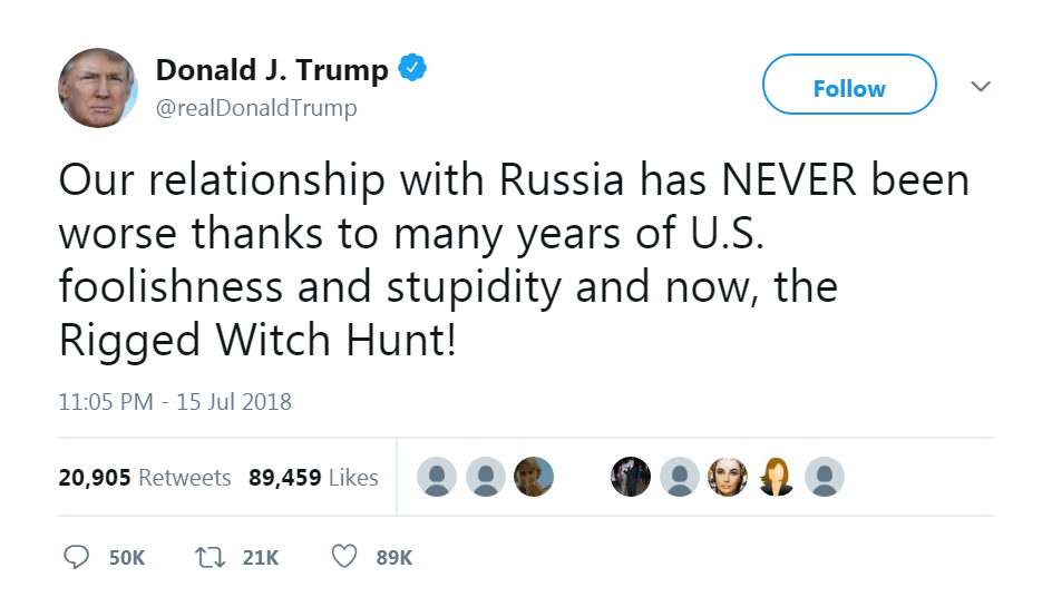 "Our relationship with Russia has NEVER been worse thanks to many years of US foolishness and stupidity and now, the Rigged Witch Hunt!" he said on Twitter.