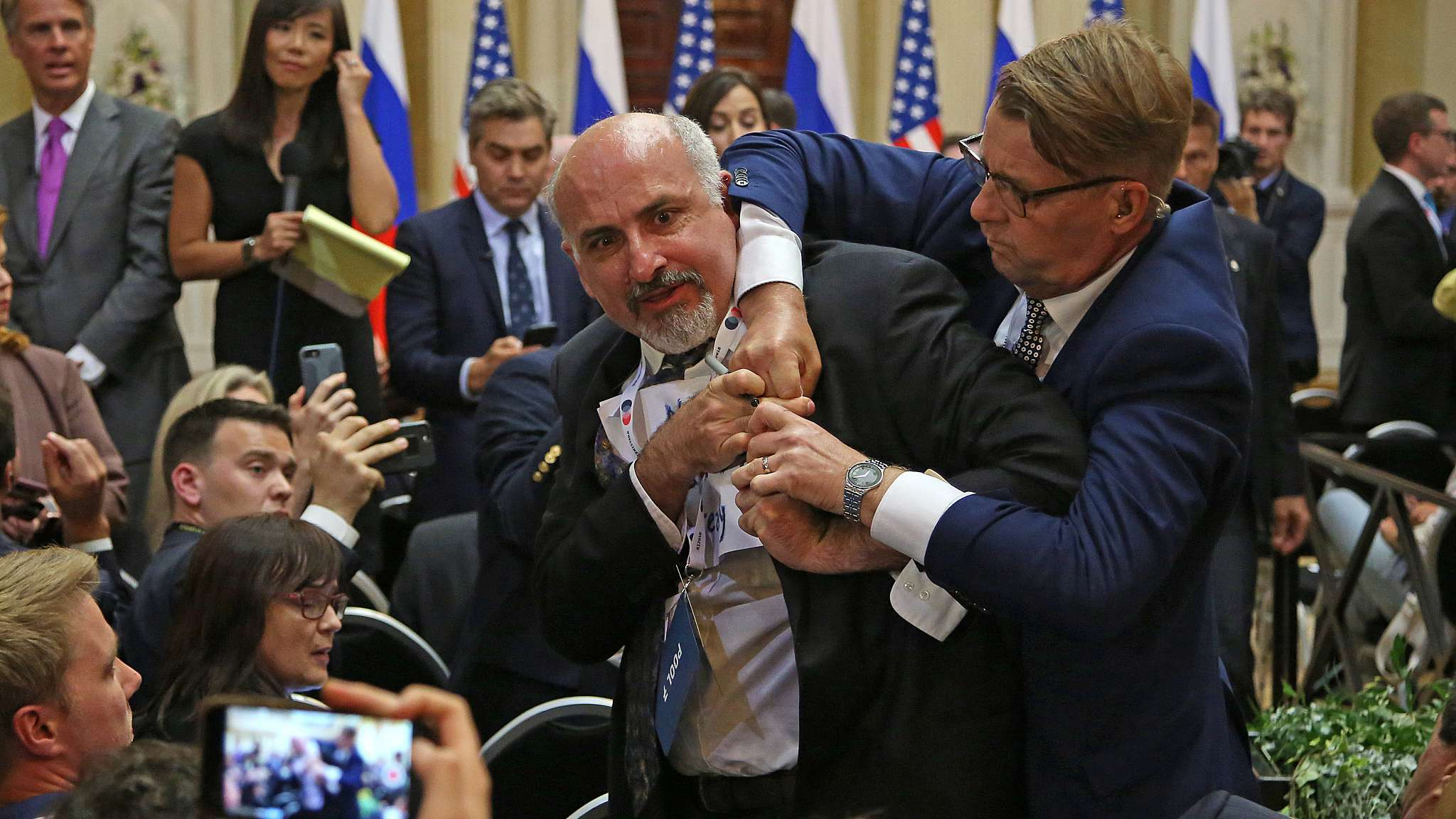A self-identified journalist holding a sign saying "Nuclear Weapons Test Ban" is ejected during the joint press conference between US President Donald Trump and Russian President Vladimir Putin at the Presidential Palace in Helsinki, Finland, July 16, 2018. /VCG Photo