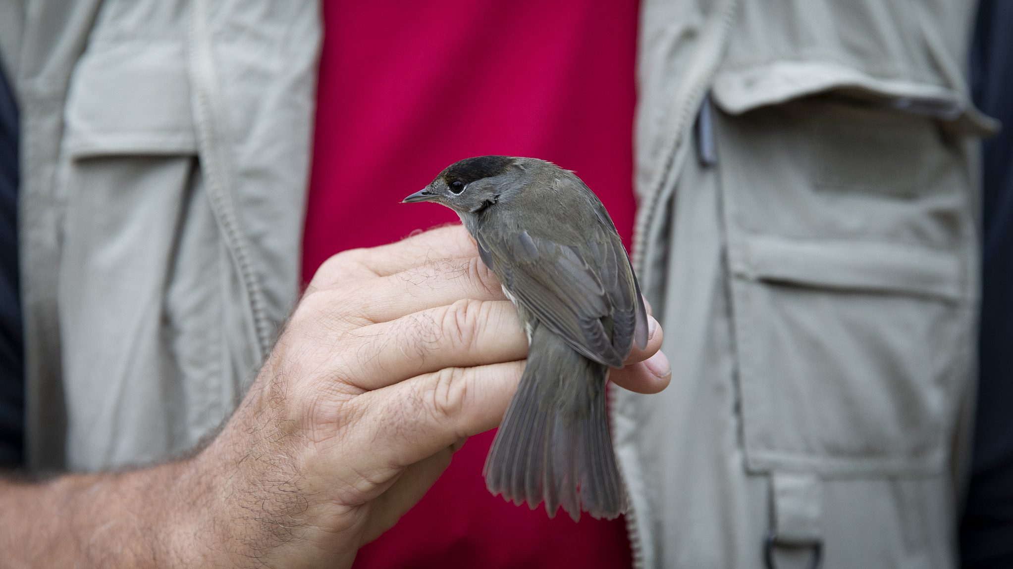 Volunteer and trained bird ringer Eugene Hood checks the underwing of a Male Blackcap. /VCG Photo