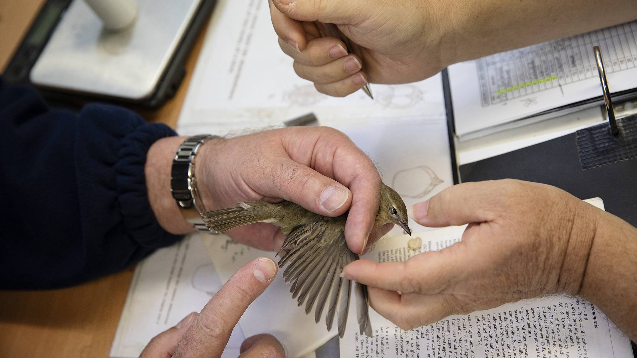 A Garden Warbler has it's tetrials checked for signs of wear to help determine age. /VCG Photo