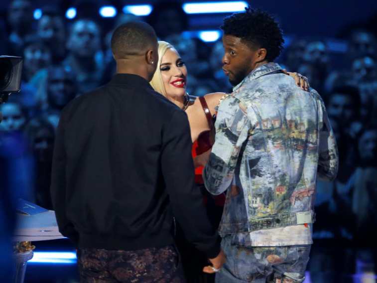 Singer Lady Gaga presents actors Chadwick Boseman (R) and Michael B. Jordan with the Best Movie award for "Black Panther" at the 2018 MTV Movie and TV Awards at Barker Hangar in Santa Monica, California, US, June 16, 2018. /Reuters Photo