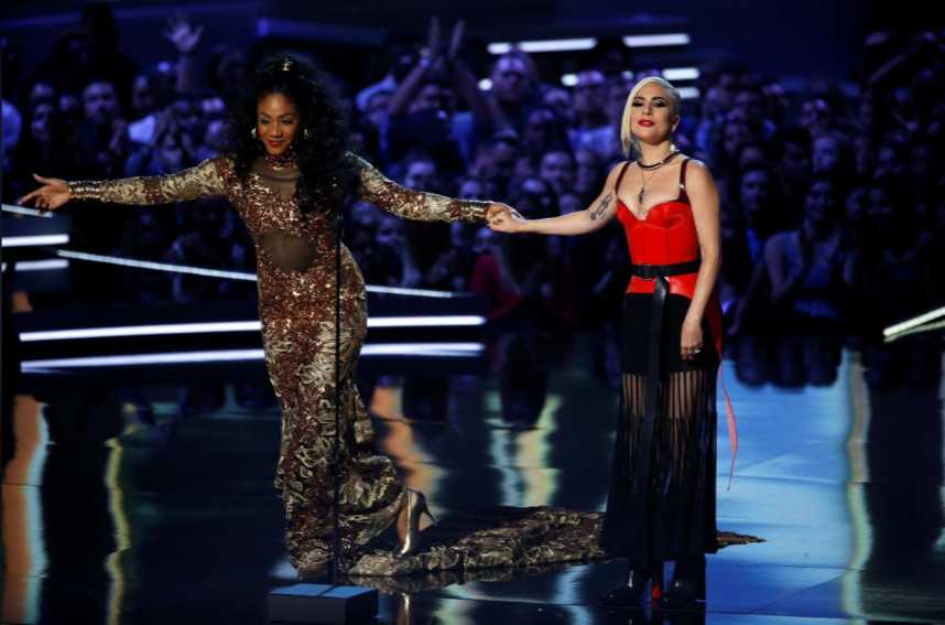 Singer Lady Gaga(R) and host Tiffany Haddish on stage at the 2018 MTV Movie and TV Awards at Barker Hangar in Santa Monica, California, US, June 16, 2018. /Reuters Photo