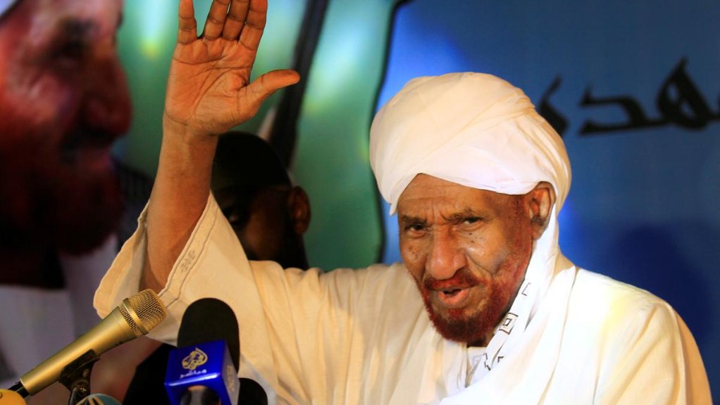 Sudan's main opposition party leader Sadiq al-Mahdi on Saturday called on President Omar al-Bashir to step down and sit with the opposition to agree on details of a transitional process to end the nation's crisis, a statement from his party said.