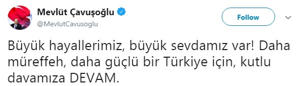 Foreign Minister Mevlut Cavusoglu used the hashtag to claim the government "will carry on with our blessed cause for a more prosperous and powerful Turkey."