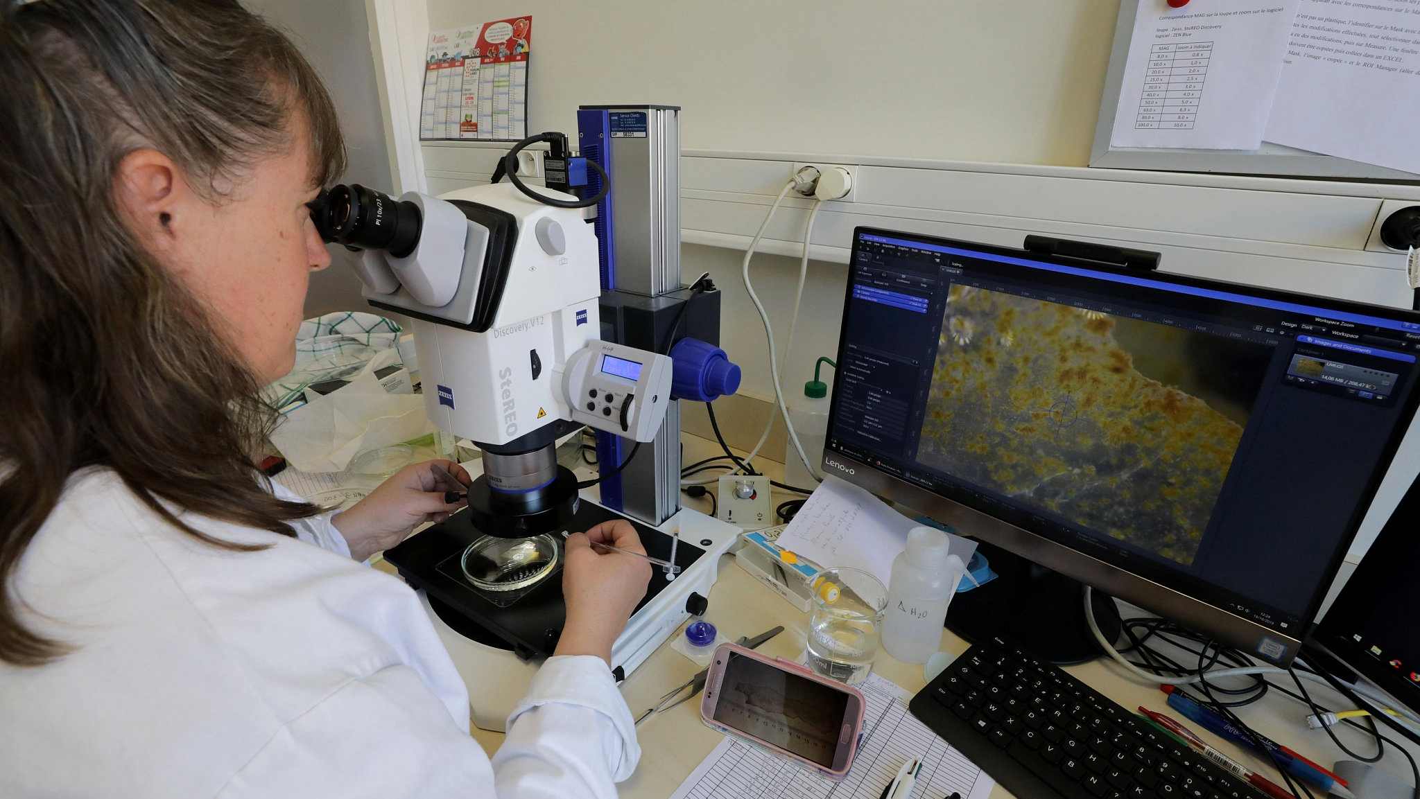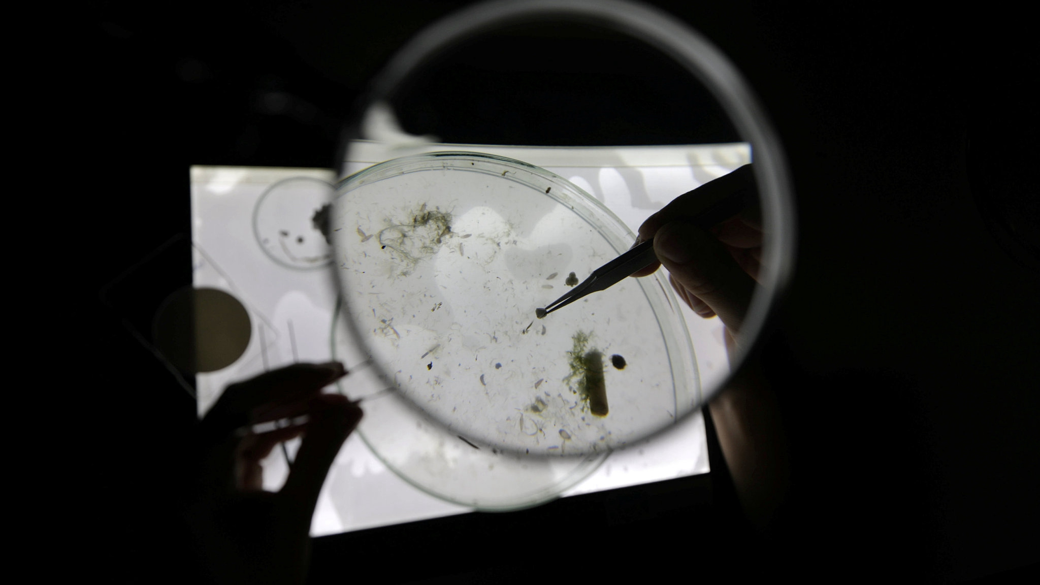 A scientist uses a magnifying glass to look at sea sample taken from the Mediterranean Sea as part of a scientific study about microplastics damaging marine ecosystems. /VCG Photo