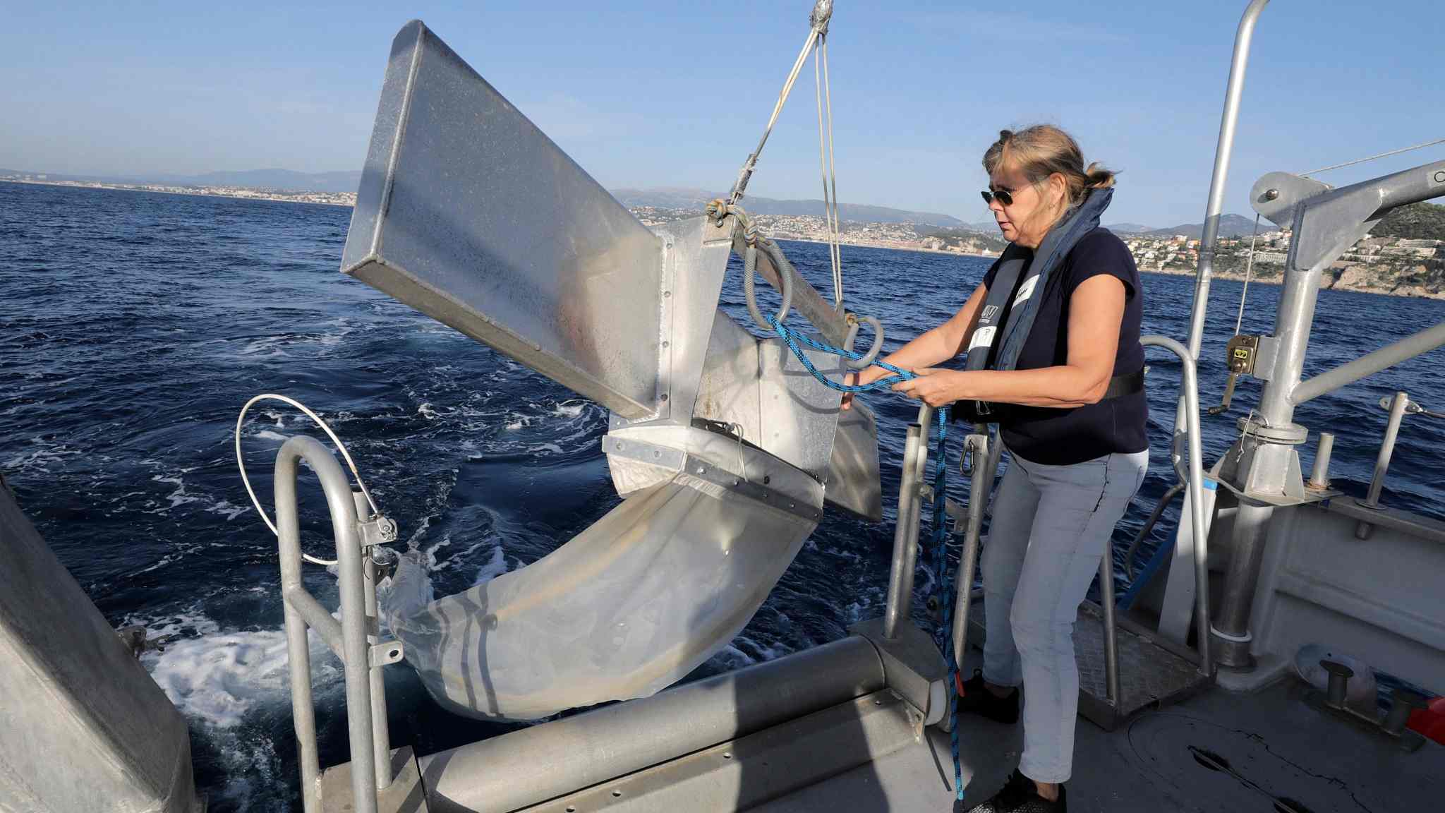 Maria-Luiza Pedrotti, a marine biologist specialized in micro-plastics, uses a net to collect sea sample taken from the Mediterranean Sea on a coastal research vessel. /VCG Photo