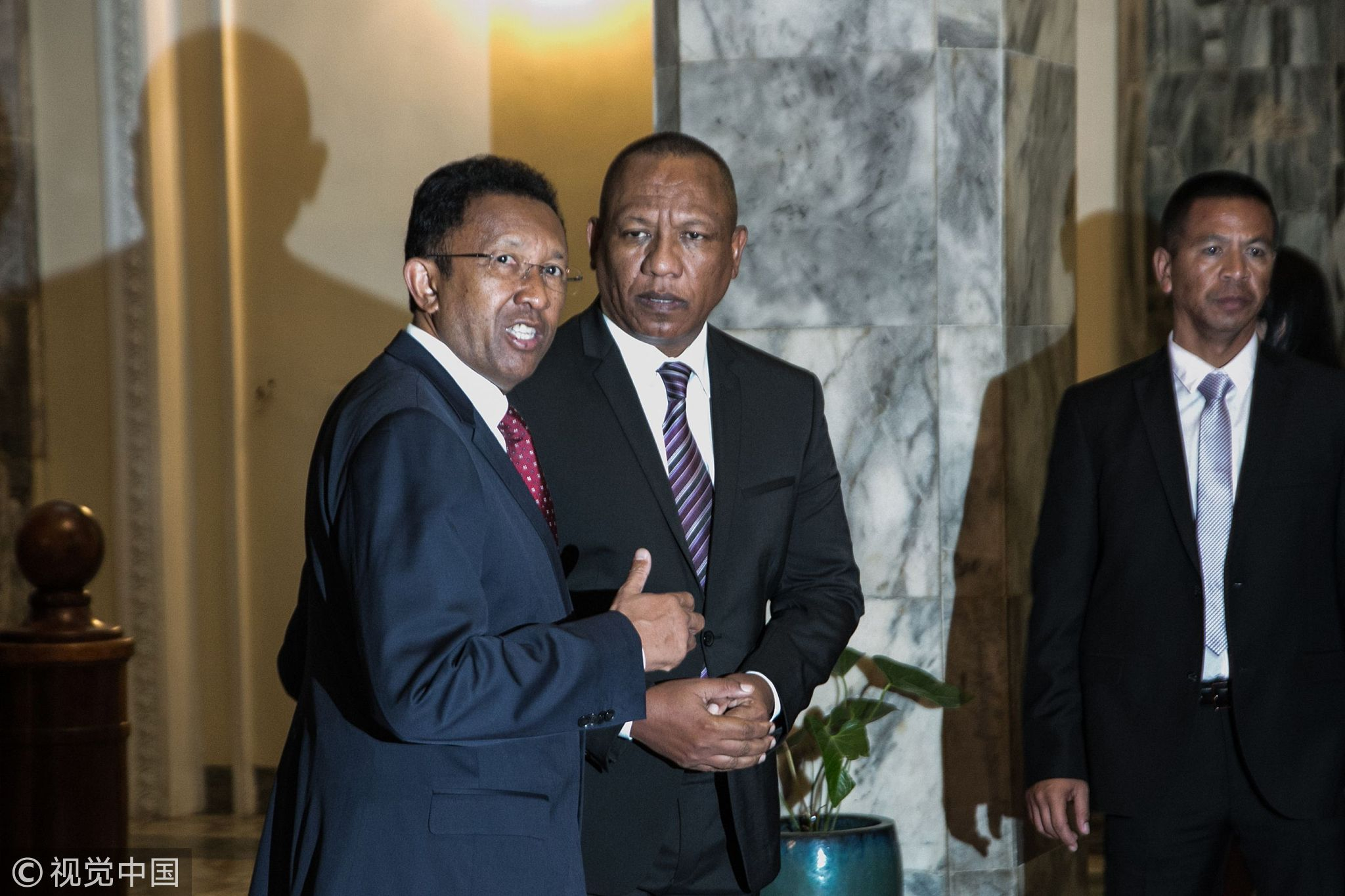 Madagascar President Hery Rajaonarimampianina (L) and Prime Minister Christian Ntsay (C) attend the announcement of the new government at the presidential palace of Iavoloha in Antananarivo, June 11, 2018. /VCG Photo
