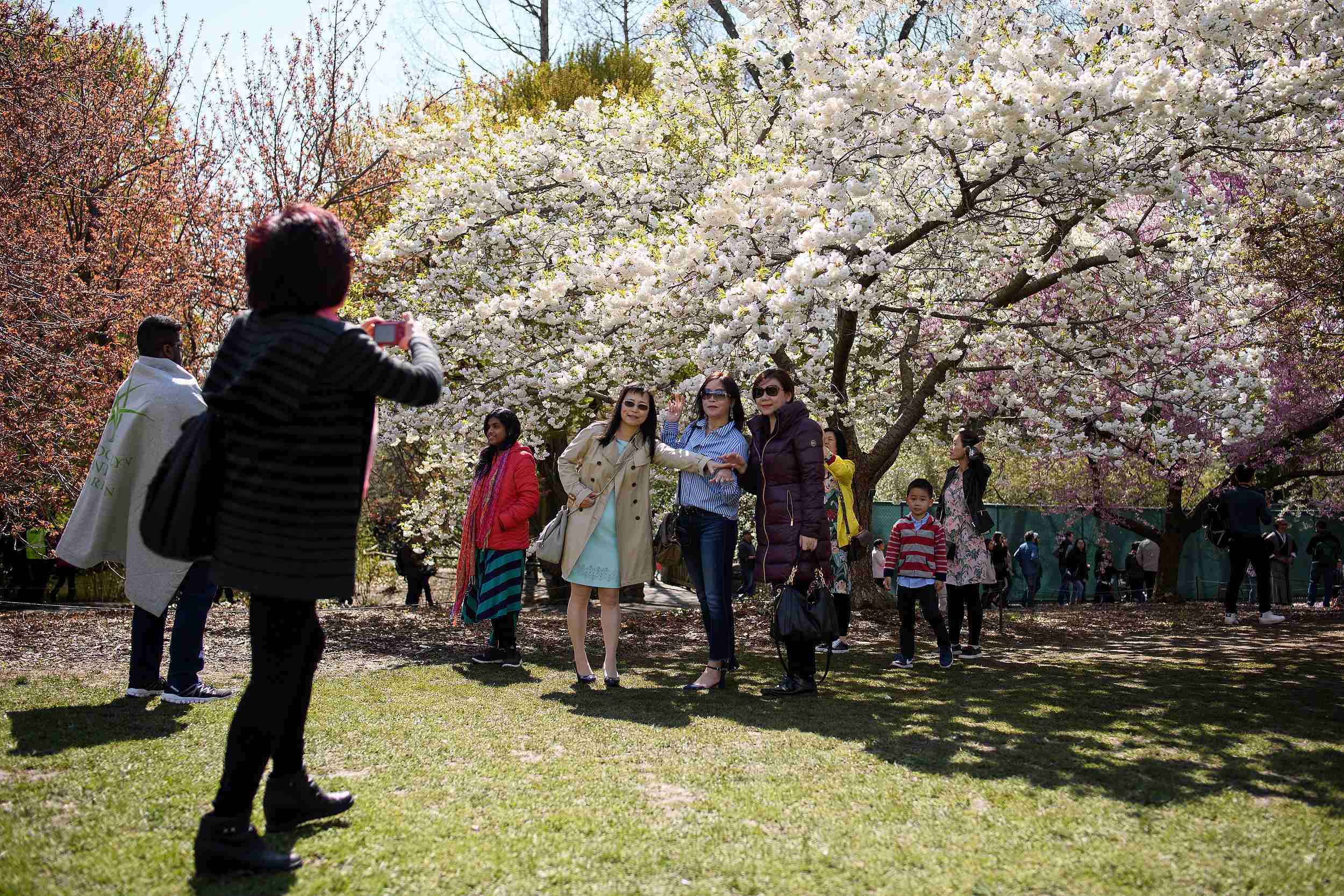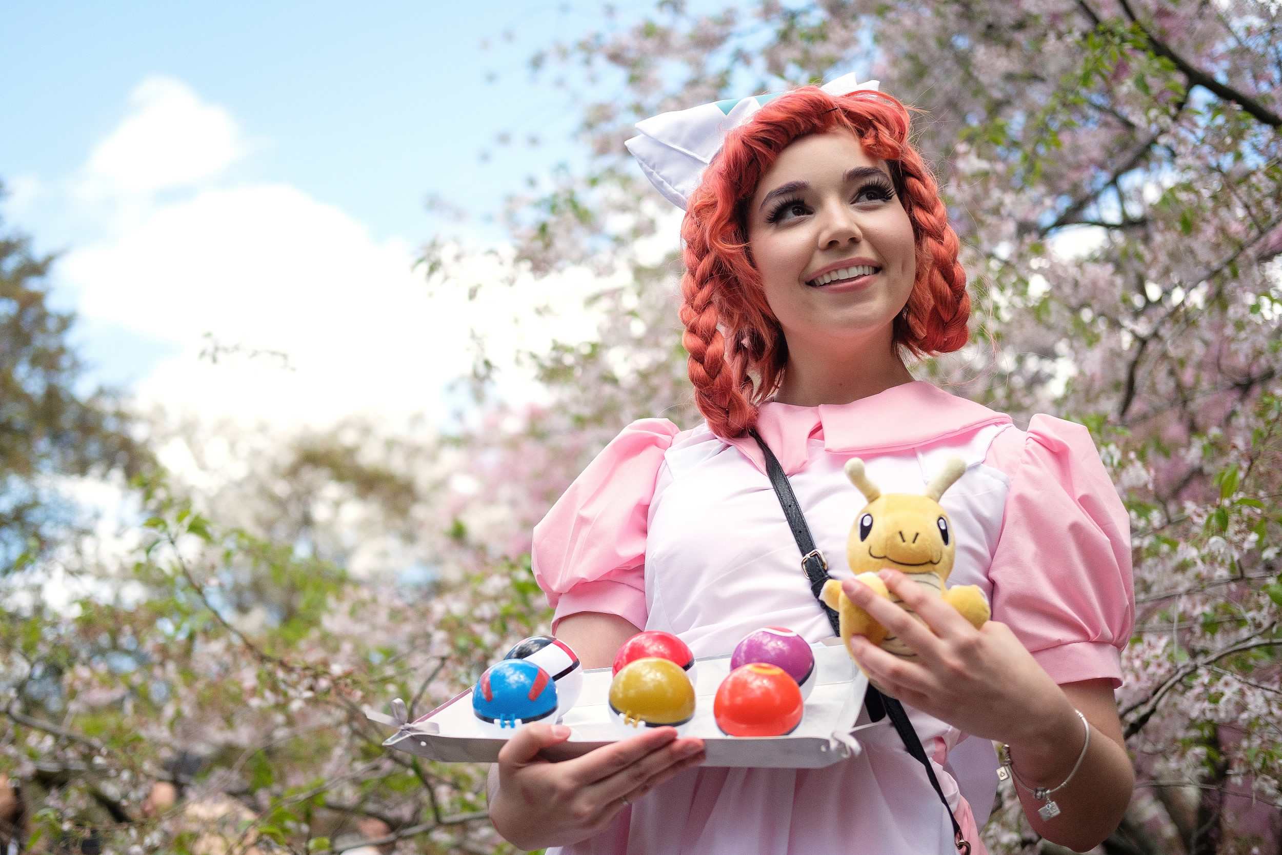 Visitor poses in a Pokemon nurse costume during the Cherry Blossom Festival at the Brooklyn Botanic Garden in New York City, US on Sunday. /VCG Photo