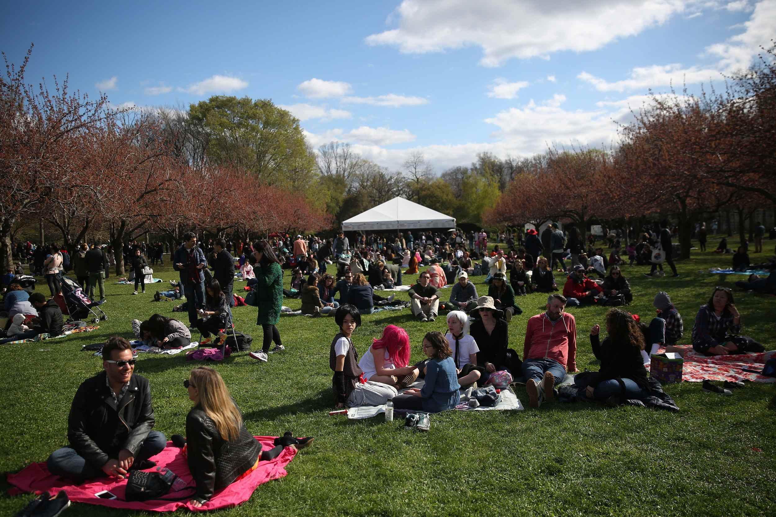 Visitors and otaku - fans of Japanese culture - enjoyed the sun among the cherry blossom trees. /VCG Photo