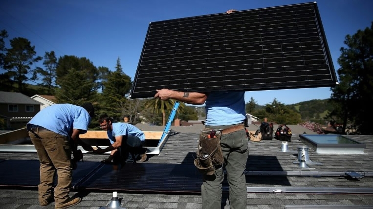 Workers install solar panels on the roof of a home in San Rafael, California, US. /AFP Photo