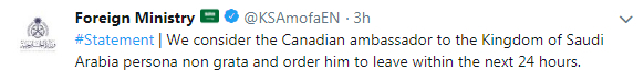 The kingdom earlier said it had declared Canadian Ambassador Denis Horak persona non grata and given him 24 hours to leave the country, and that it was recalling its ambassador from Ottawa for consultations.