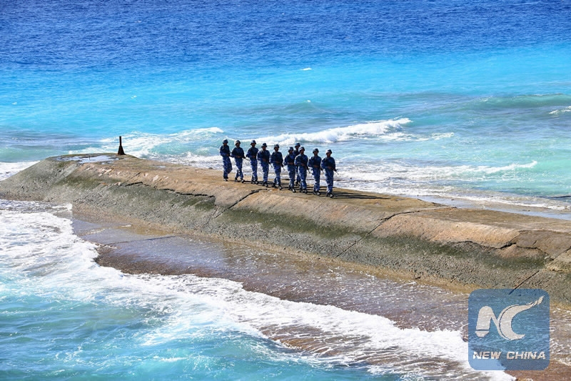 Chinese soldiers are on patrol on a breakwater on Yongshu Reef in the South China Sea, January 6, 2016. /Xinhua Photo