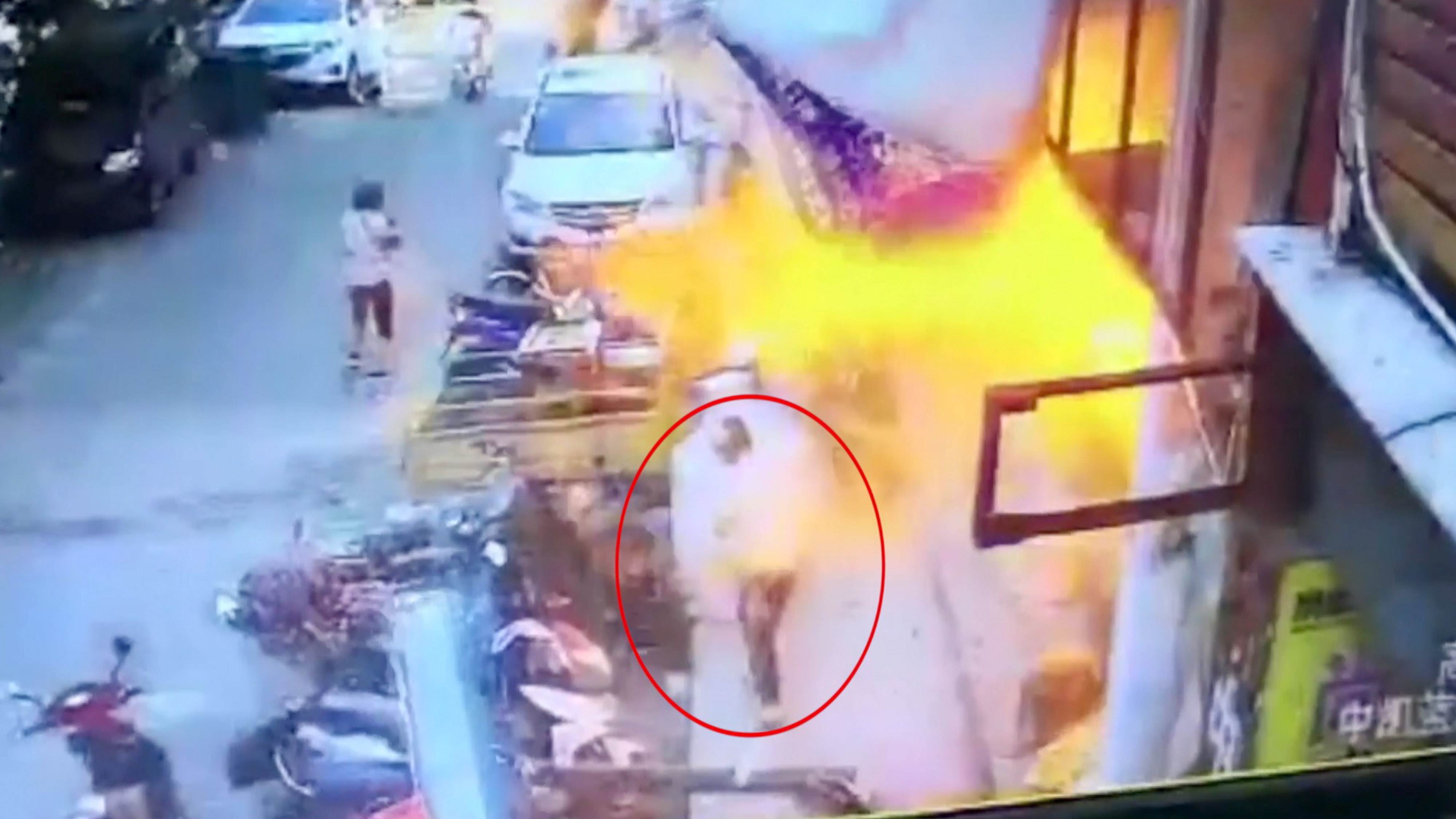 A security camera caught the dramatic moment of a fireball bursting from a gas cylinder at a restaurant, engulfing a man in flames in Nanchang City, East China’s Jiangxi Province on Sunday.