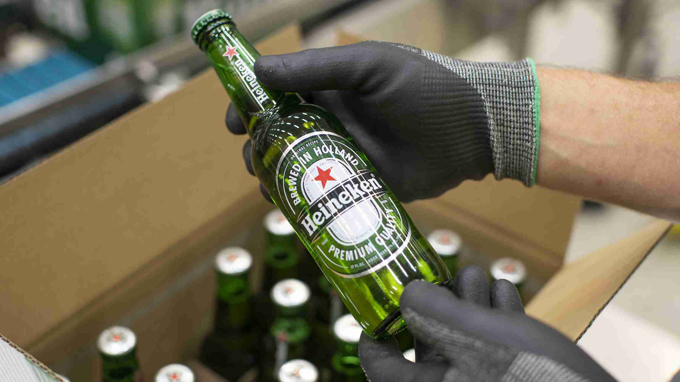 An employee carries out quality checks on a Heineken beer bottle. / VCG Photo