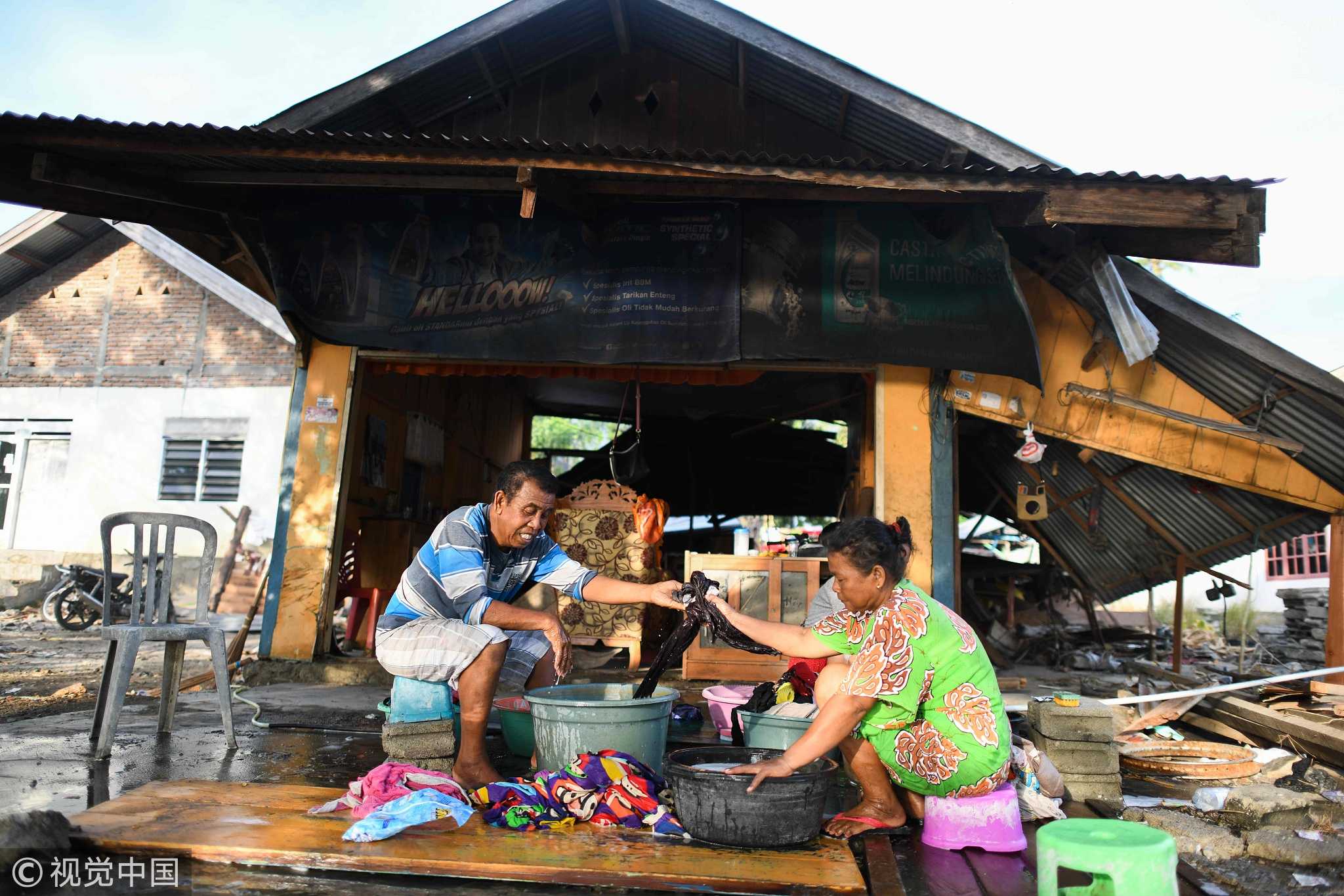 An earthquake-affected family washes their clothes in front of their damaged house on the outskirts of Palu in Indonesia's Central Sulawesi, October 5, 2018. /VCG Photo