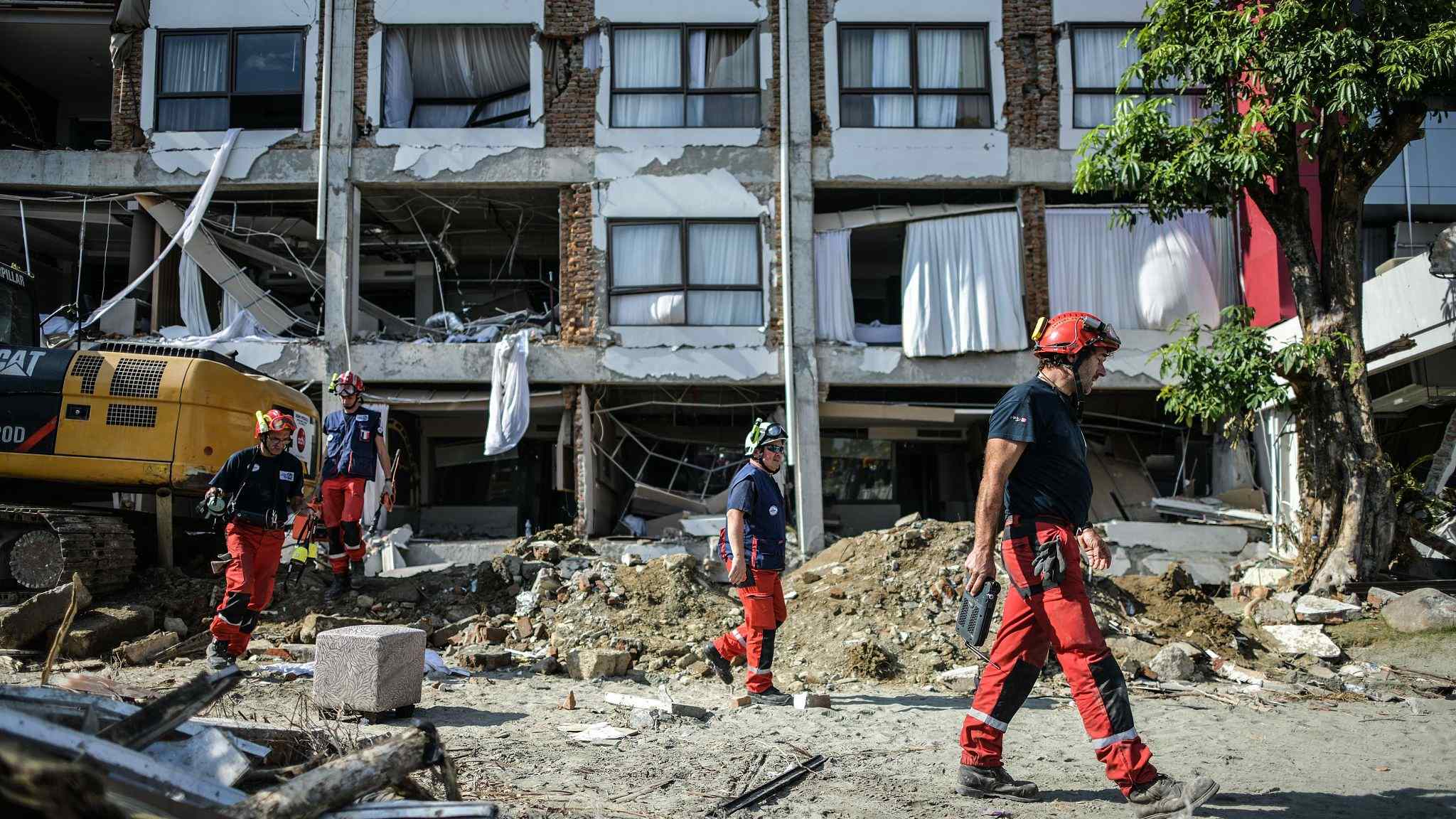 (Cover photo: Members of the French NGO International Emergency Firefighters leave the badly damaged Mercure hotel after search and rescue operations in Palu in Indonesia's Central Sulawesi, October 5, 2018. /VCG Photo)