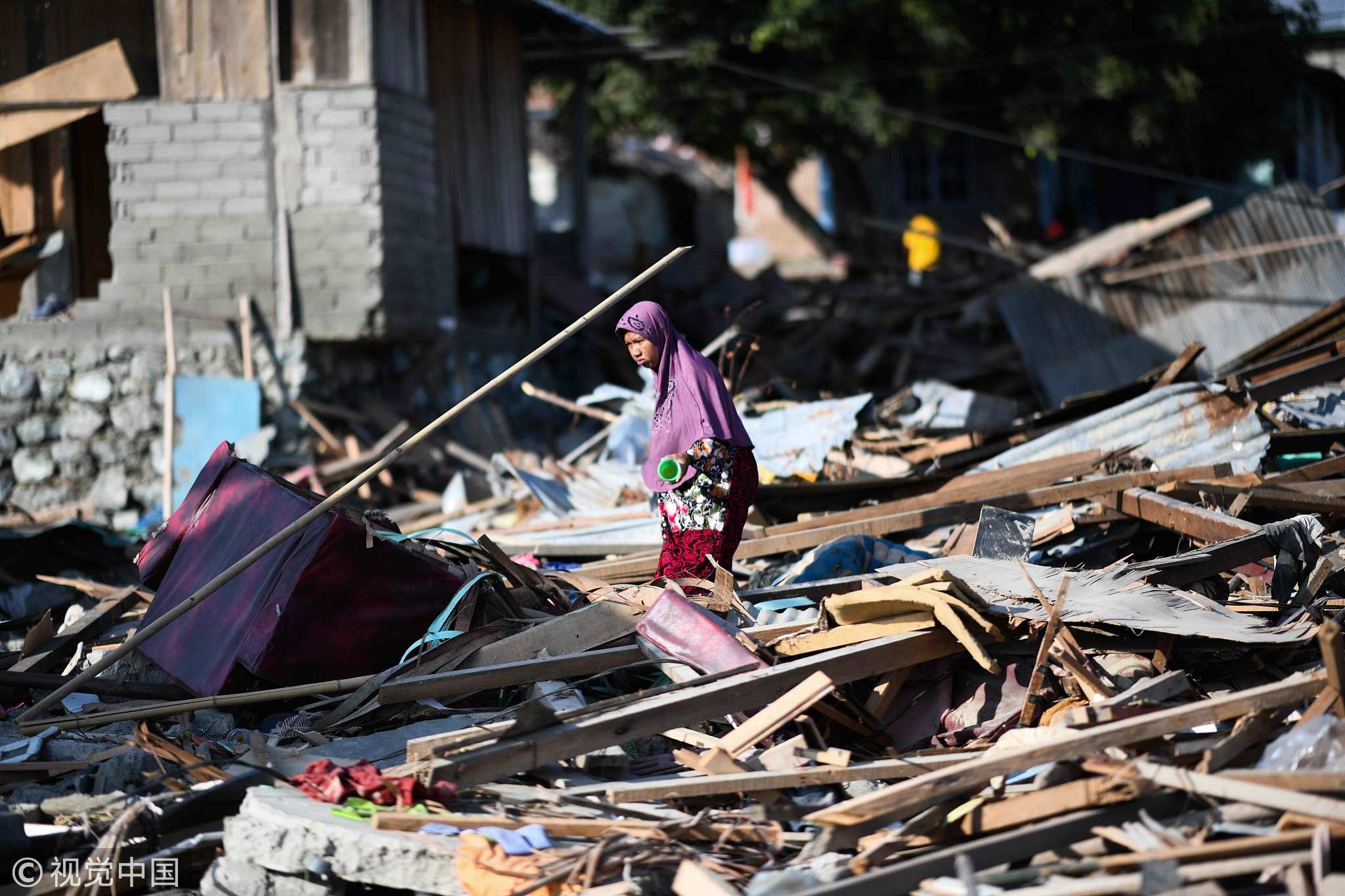 An earthquake-affected woman looks for salvageable items among the debris of a house, October 5, 2018. /VCG Photo