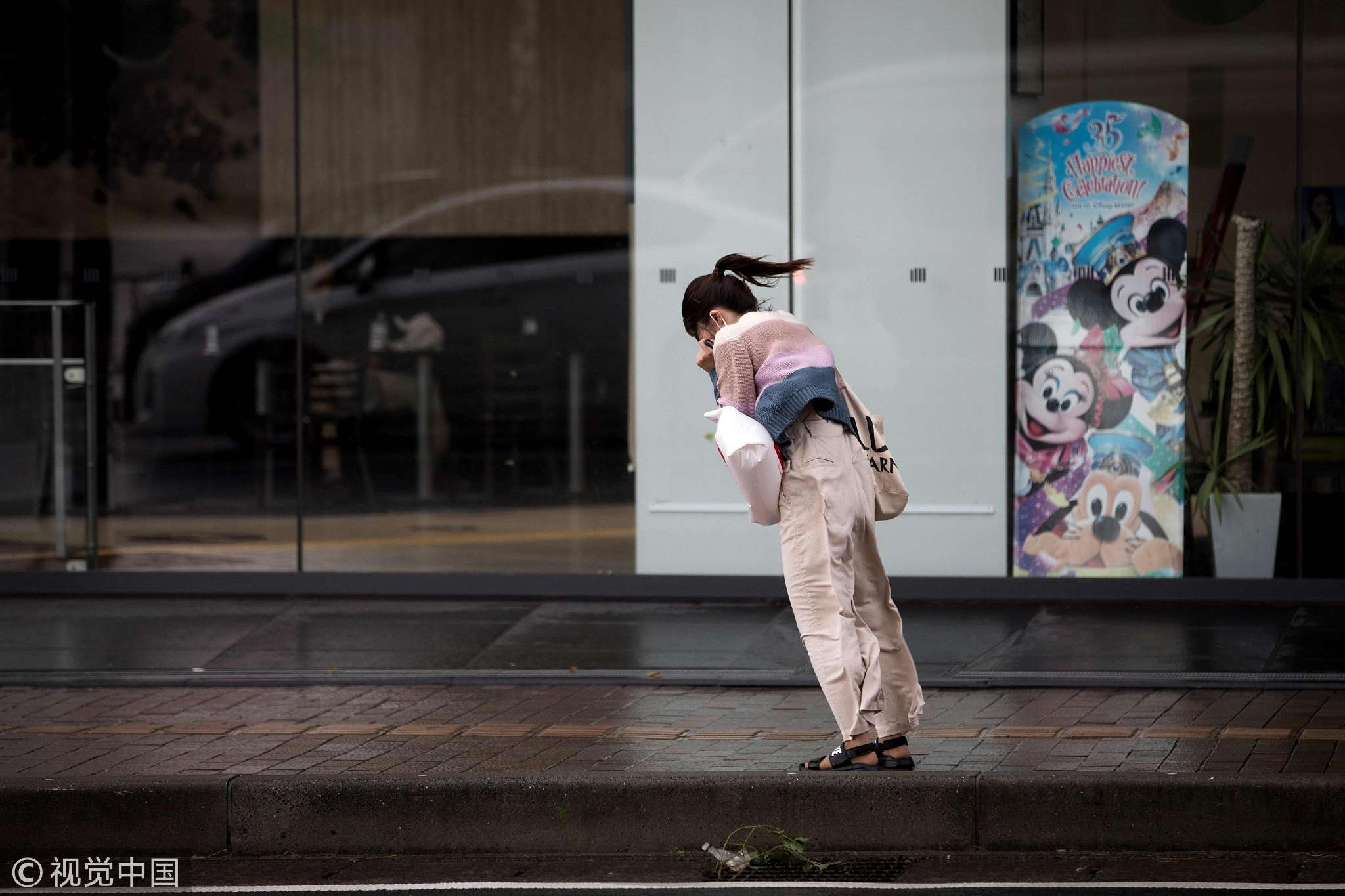 A woman walks against the strong winds after Typhoon Trami hit the city of Kagoshima on Kyushu island, September 30, 2018. /VCG Photo