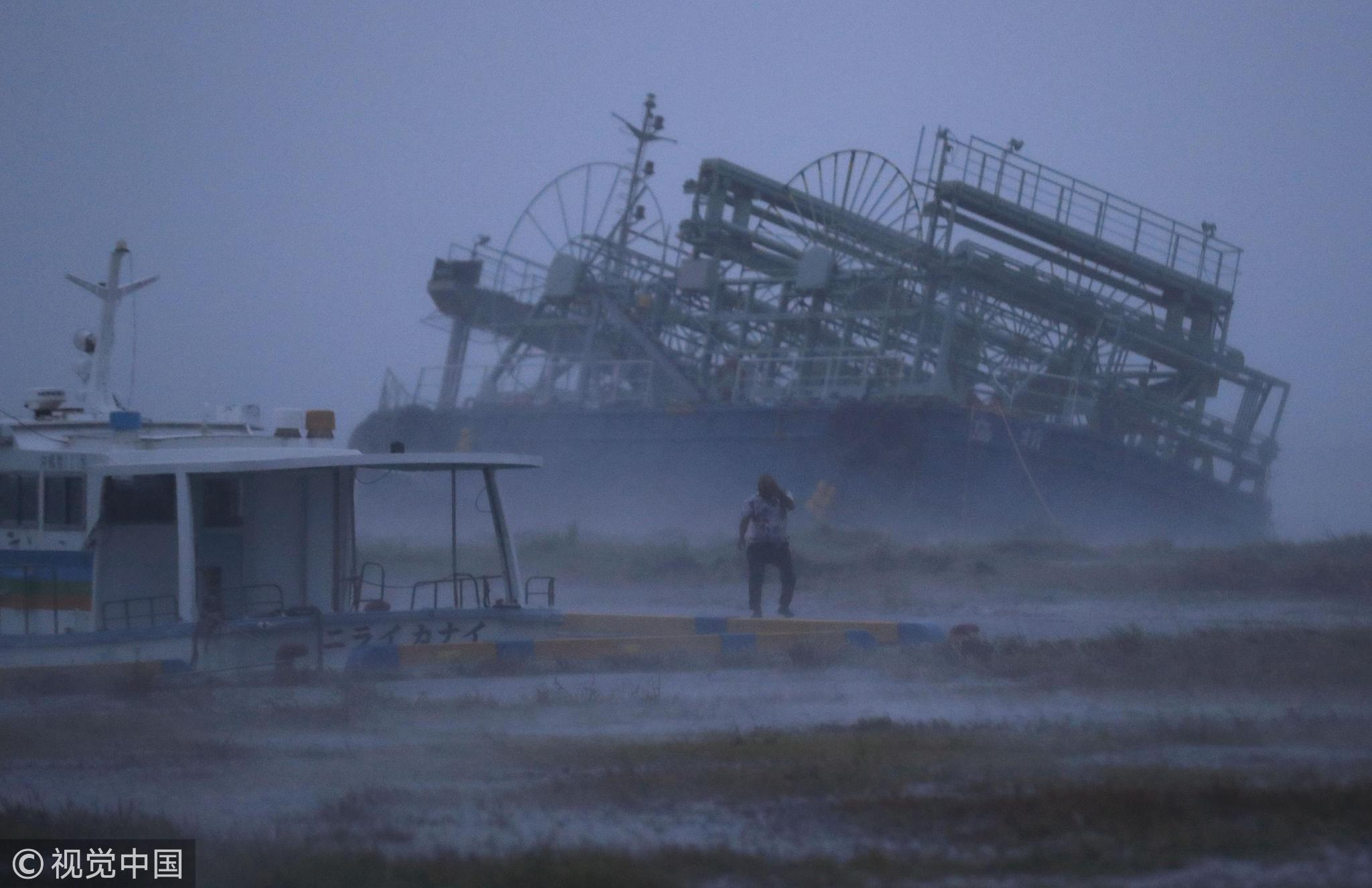 A ship (back) washes ashore at a port in Yonabaru, Okinawa Prefecture as Typhoon Trami approaches Japan's southernmost prefecture, September 29, 2018. /VCG Photo
