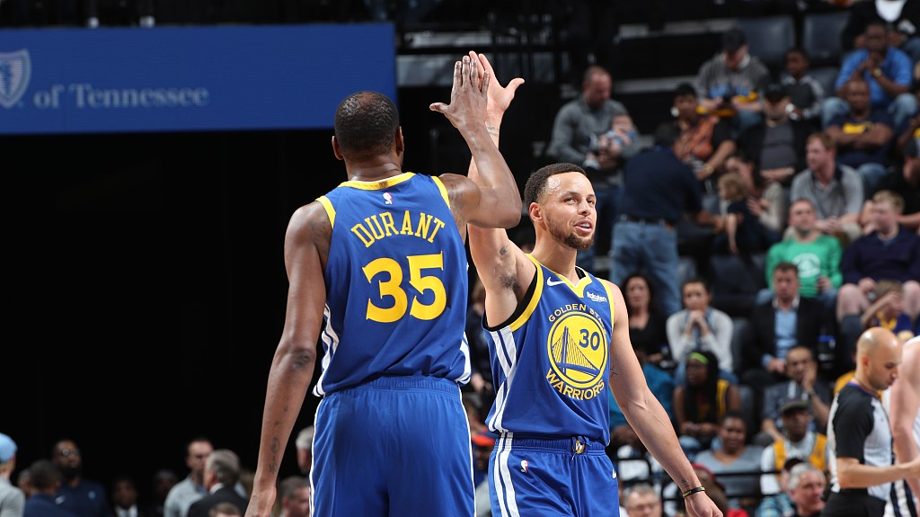 Kevin Durant #35 and Stephen Curry #30 of the Warriors highfive each other in the game against the Grizzlies, March 27. /VCG Photo