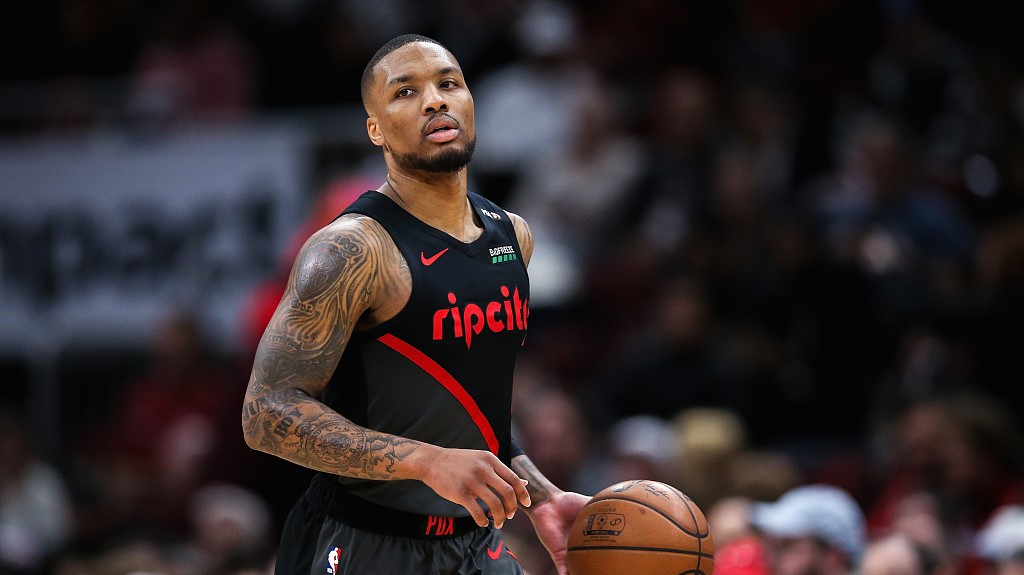 Damian Lillard of the Portland Trail Blazers handles the ball in the game they win against the Chicago Bulls 118-98 at the United Center, March 27, 2019. /VCG Photo