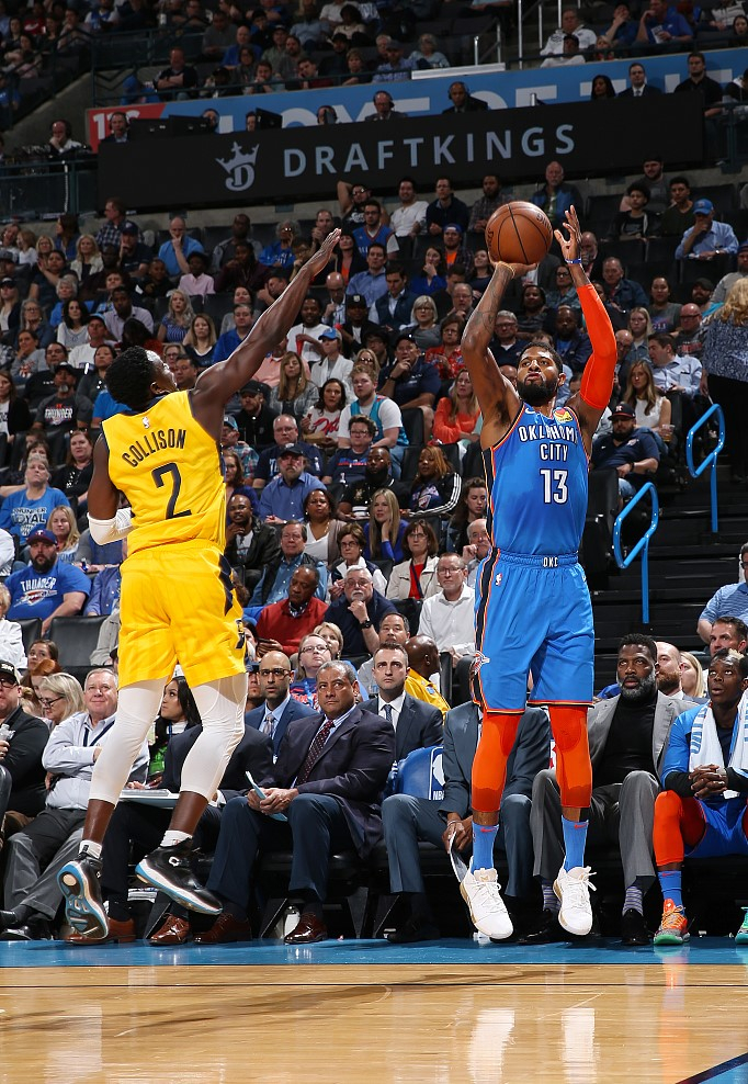 Paul George #13 of the Oklahoma City Thunder shoots a three-pointer in the game they win against the Indiana Pacers 107-99 at the Chesapeake Energy Arena, March 27, 2019. /VCG Photo