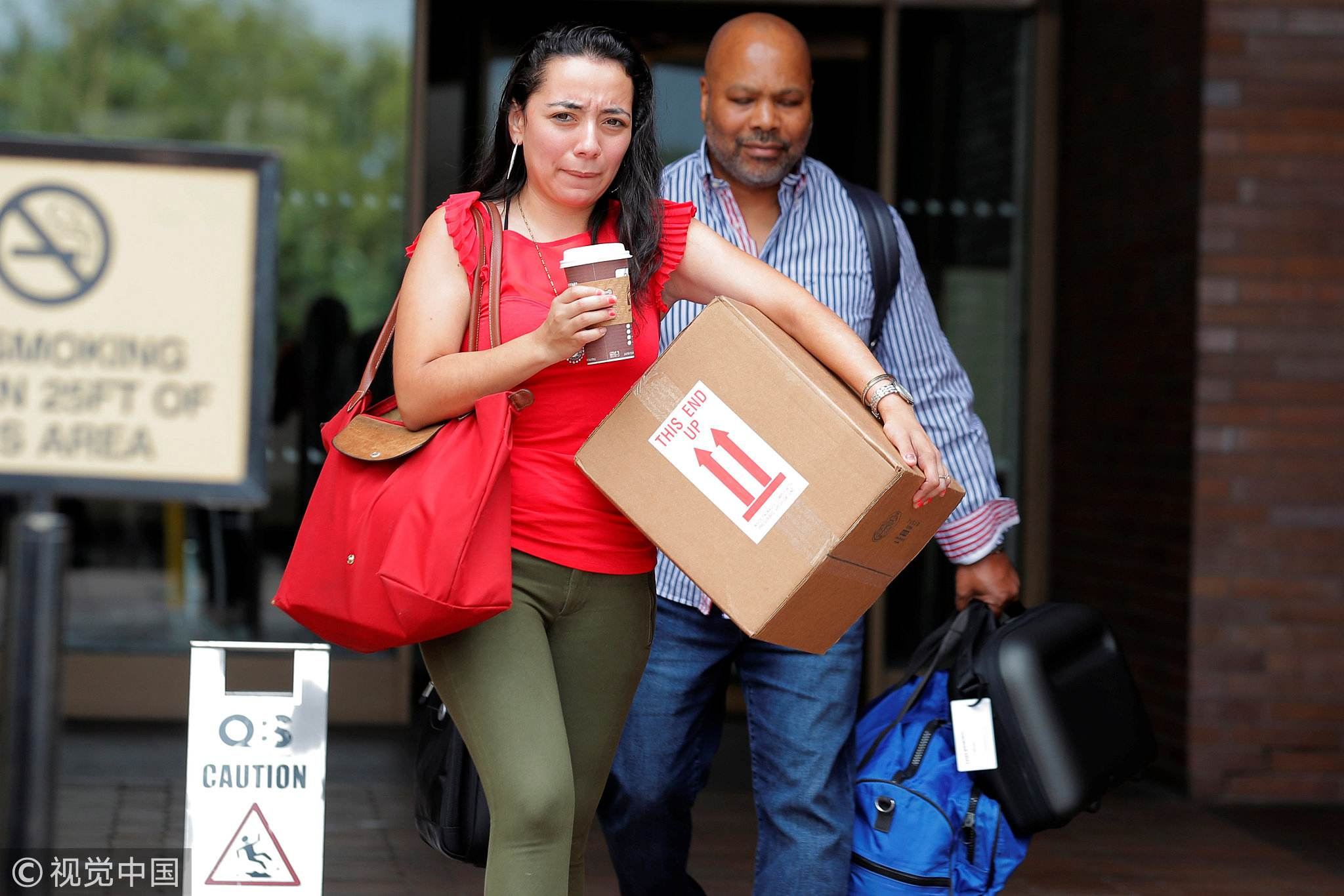 Former New York Daily News editorial staff members Carla Roman (L) and Reggie Lewis depart the newspaper's Manhattan office. /VCG Photo
