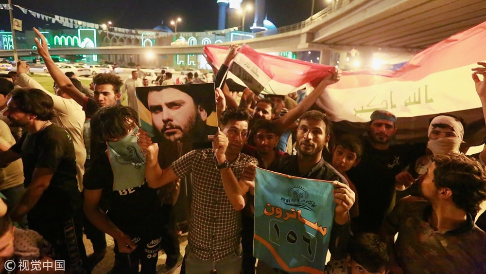 Iraqi supporters of Sairun list celebrate with Iraqi flags and a picture of Shi'ite cleric Moqtada al-Sadr after results of Iraq's parliamentary election were announced, in Najaf, Iraq, May 15, 2018. /VCG Photo