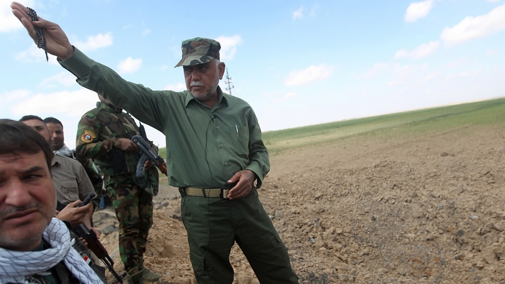 March 22, 2015: Hadi al-Ameri (R), stands in the Al-Alam area, north of Baghdad, Iraq, as he talks to the media about the ongoing fighting between Iraqi government forces and jihadists of the ISIL group for the control of the nearby city of Tikrit. /VCG Photo