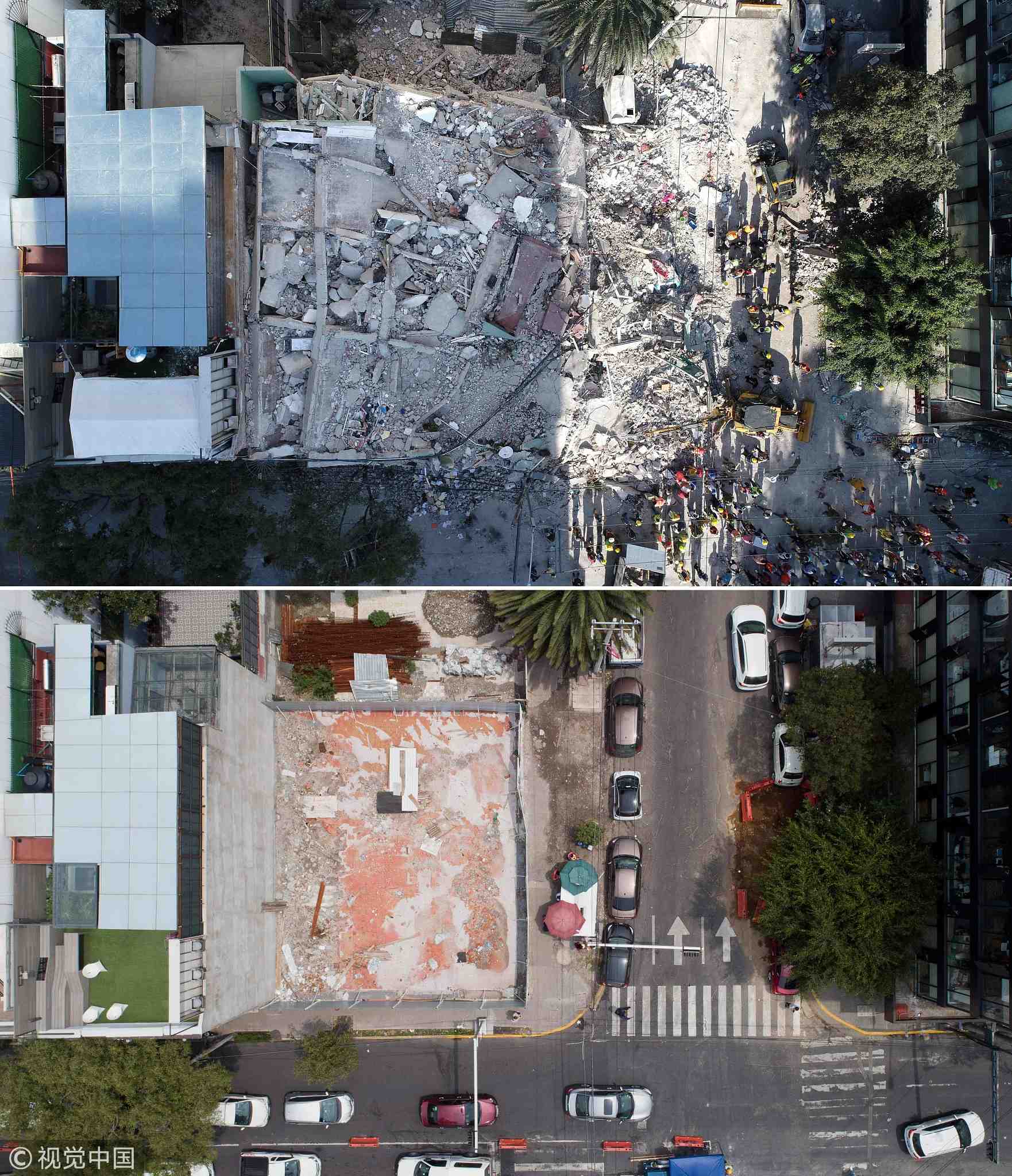 These pictures show a file picture taken on September 19, 2017 (top) of rescuers searching for survivors in a flattened building at Roma neighborhood in Mexico City moments after a strong quake hit central Mexico, and the same place on September 10, 2018 (bottom). /VCG Photo