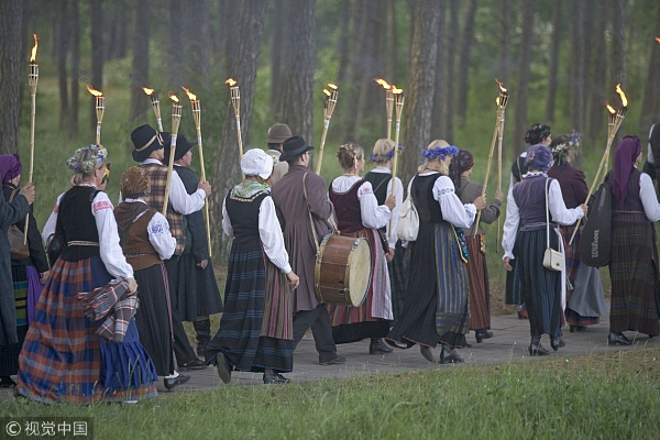 File of the torch-lit procession of people wearing traditional clothing in Lithuania. /VCG Photo