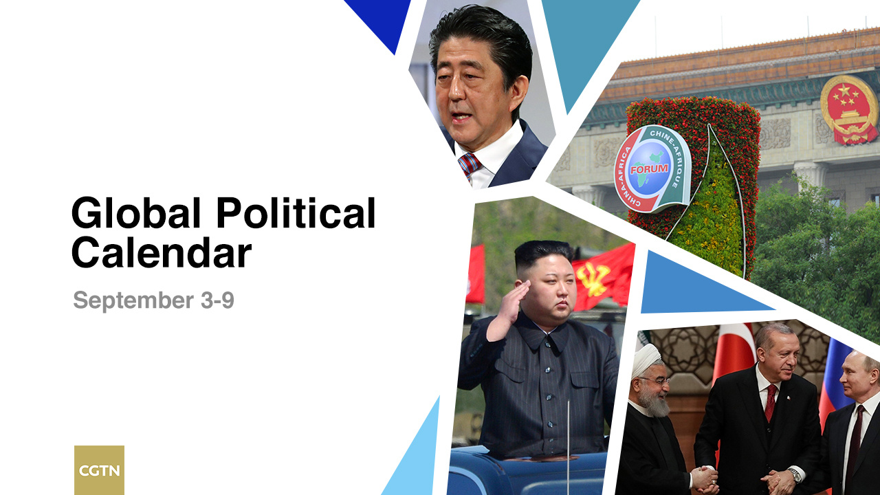 The 2018 Beijing summit of the Forum on China-Africa Cooperation (FOCAC) will take place from Monday to Tuesday. Russian President Vladimir Putin, Turkish President Recep Tayyip Erdogan and Iranian President Hassan Rouhani will hold a three-way summit in Iran to discuss the peace process in Syria on Friday. Campaigning for the leadership election of Japan's ruling Liberal Democratic Party (LDP) will kick off on the same day. The Democratic People's Republic of Korea (DPRK) will celebrate its 70th founding anniversary on Sunday.