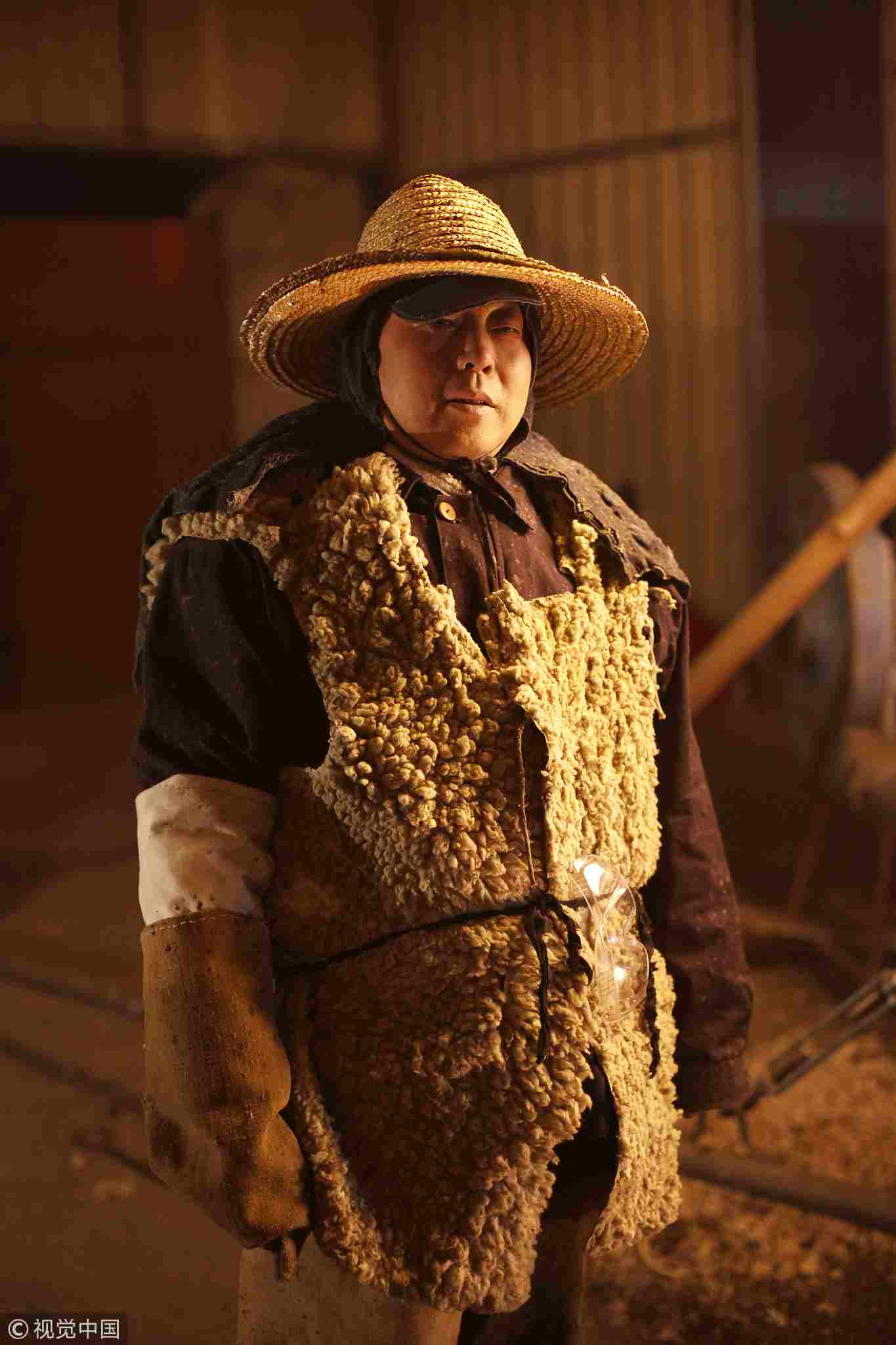 A master wears a sheepskin coat to avoid being burned during the show. /VCG Photo