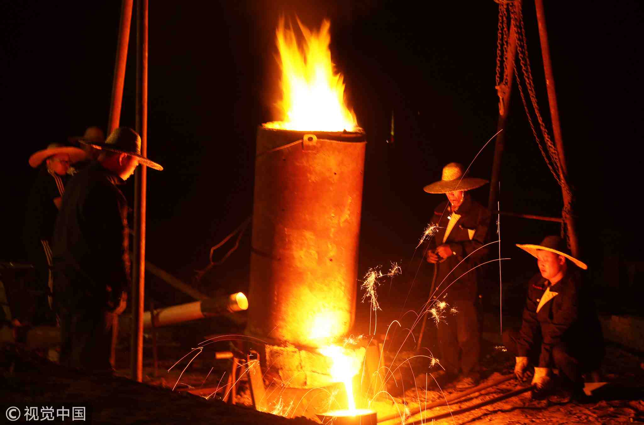 When the hot liquid iron melts the night before is poured into the pot in front of the wall, a master picking a wooden spoon comes in, as long as the white spoon in his hand reaches into the molten iron, the liquid spring up immediately.